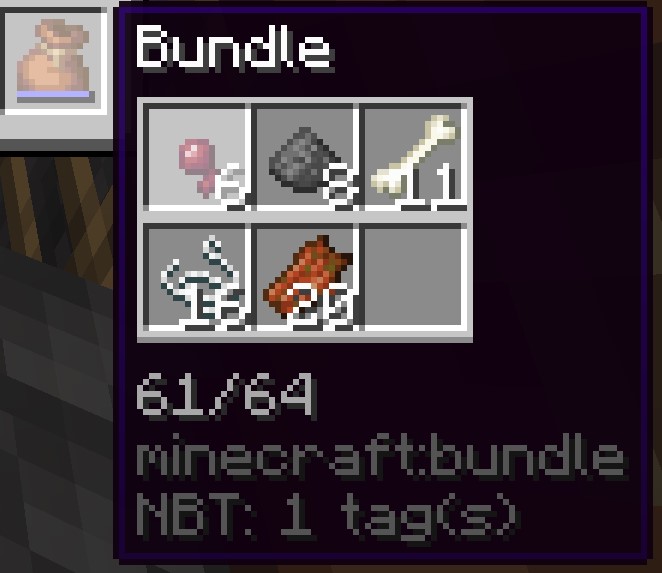 Hovering over the bundle shows its contained items in its inventory slots. The number of bundle slots used is displayed as <fullness>/64 in the tooltip. If the bundle is full, then the empty slots are greyed out with an .