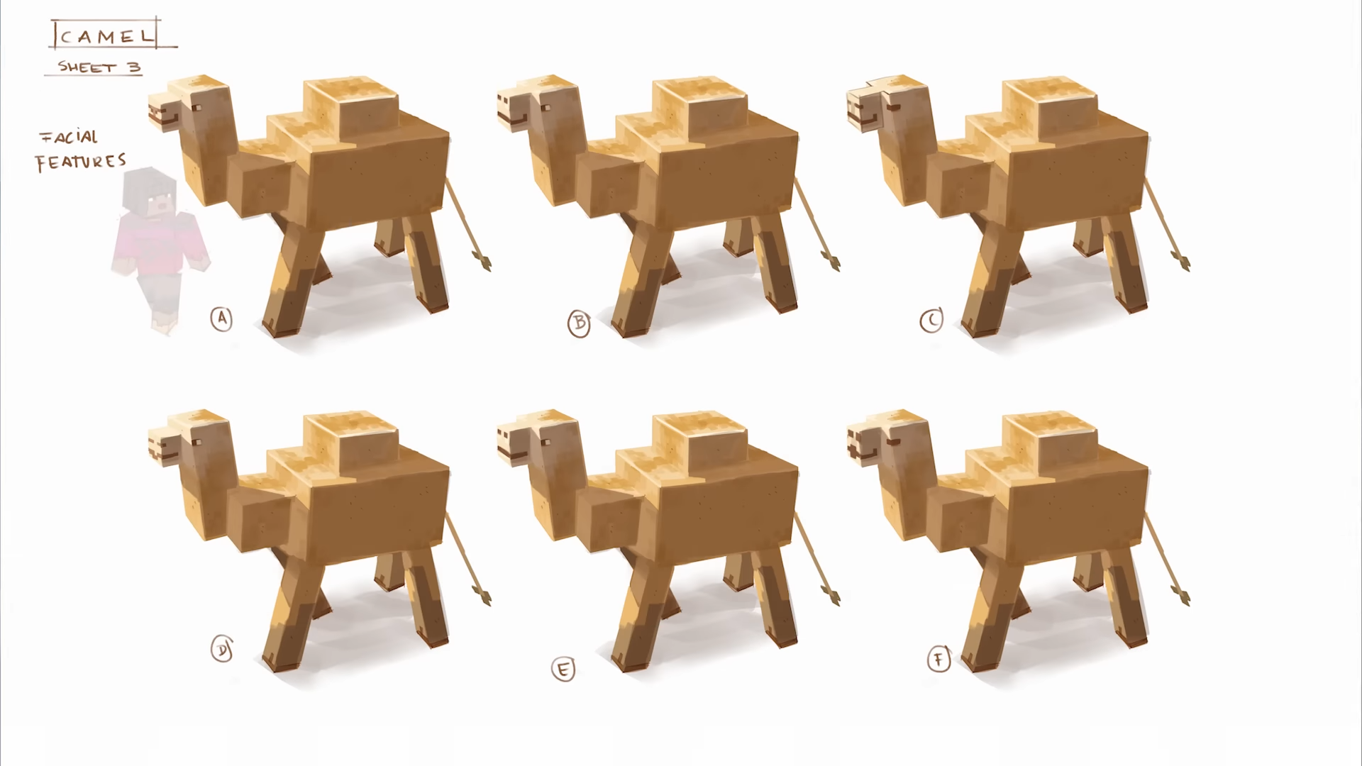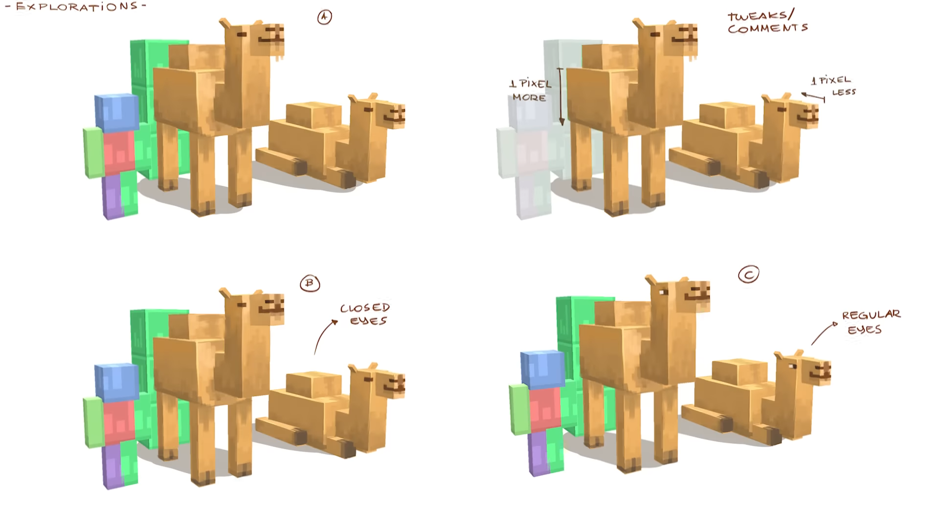 - ↑ "Minecraft’s camels have just one hump – but originally, they had two! As revealed by Alexander Sandor in our developer diary, the first camel model in the game was “basically a teddy bear with two humps”. “I shouldn’t say it was ugly...” added Agnes Larsson. So, it got a redesign into the version you see today." – Minecraft.net