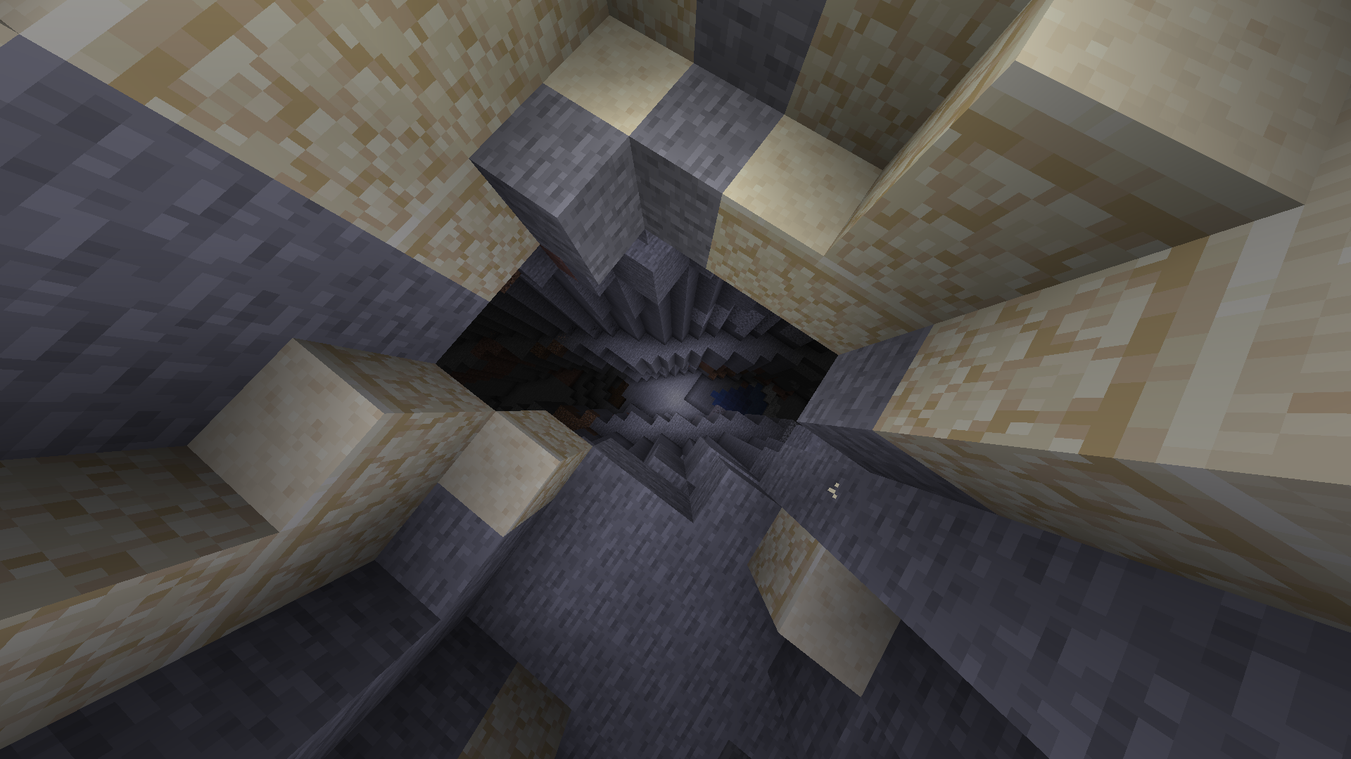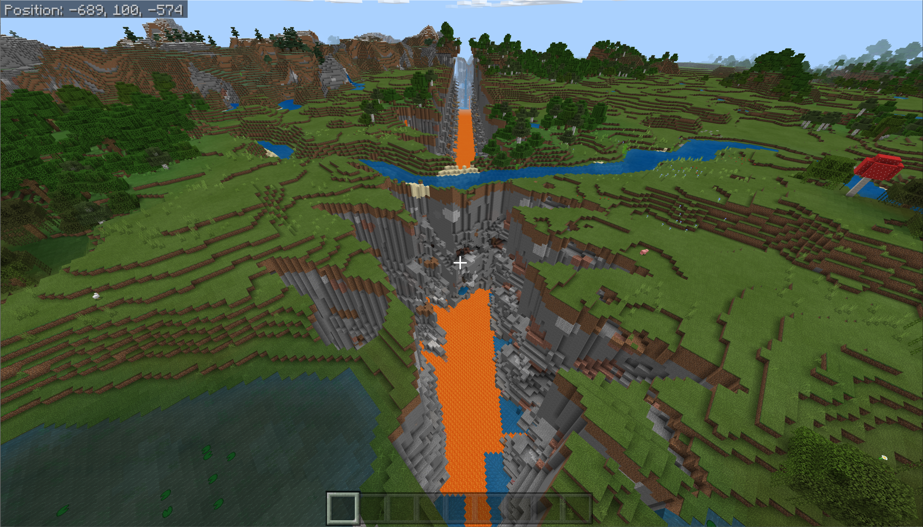 Canyons can have small ledges along the top. They can be found at levels 10 to 72, sometimes appearing on the world surface or underwater, forming canyons. They can go deep underground, sometimes spawning slimes or exposing diamond ore. If they reach deep enough, they may also be floored by the lava lakes at level 10. Canyons can cut from surface level all the way down to bedrock, especially noticeable in the Amplified world type.