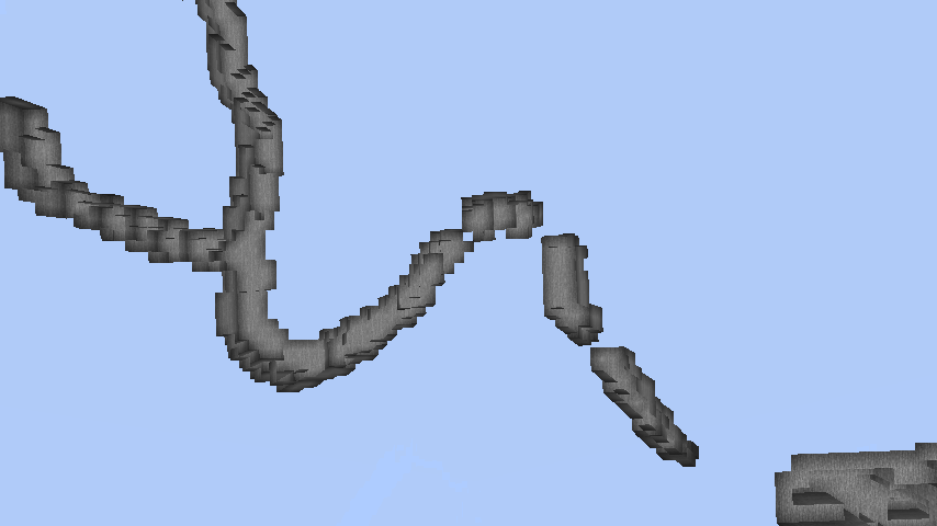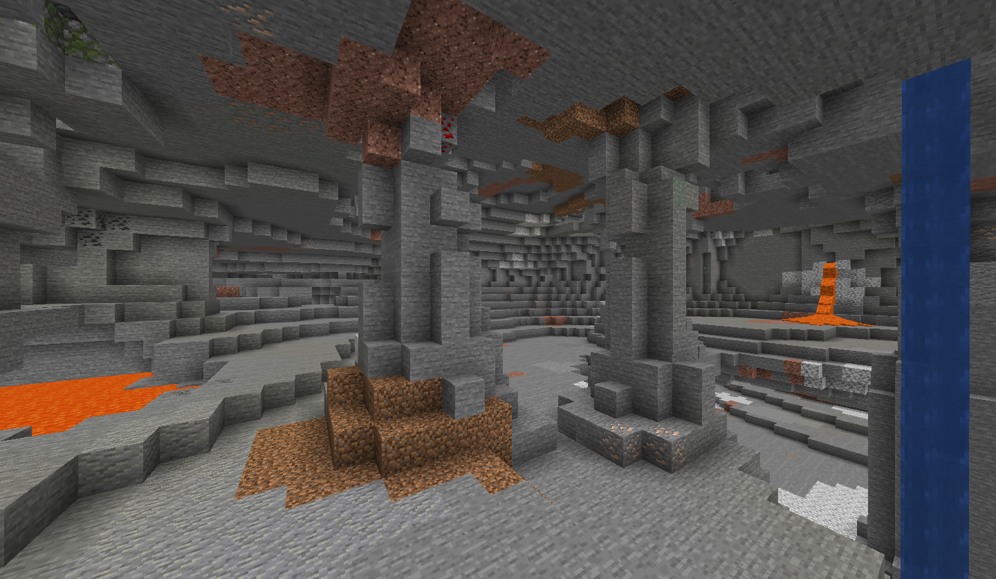 Noise caves are generated using a noise. They come in the form of cheese caves, spaghetti caves, and noodle caves.[3] By adjusting noise frequency, hollowness (for cheese caves), and thickness (for spaghetti caves, noodle caves, and noise pillars), noise caves can vary in extremely diverse ways. When generating noise caves, the game firstly generates a random noise field, and "smudges" it using a mathematical trick called Perlin noise. These processes then result in a 3D noise image. Noise pillars also generate inside cave blobs.