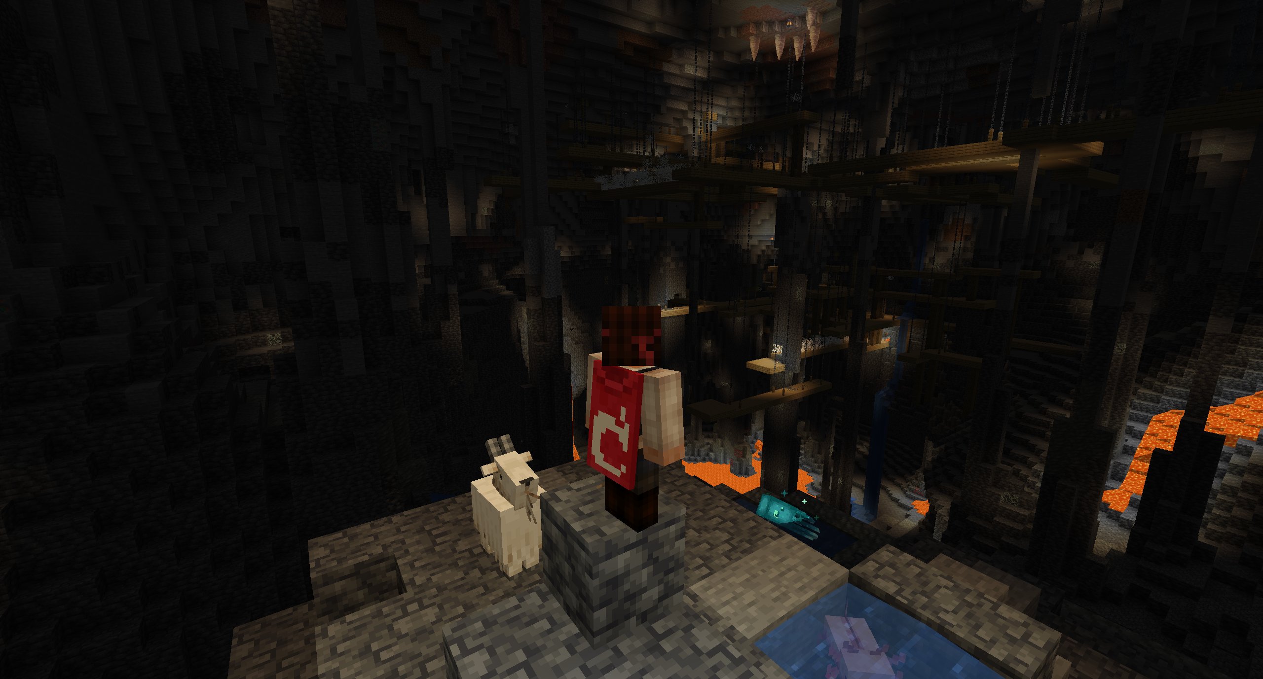 A cave (also known as a cavern) is a common terrain feature that generates in the Overworld and the Nether. Caves are usually found underground. They are open spaces of various sizes and shapes that often intersect with each other or with different generated structures, creating vast cave systems. They feature an abundance of ores, as well as hostile mobs that spawn in the darkness.