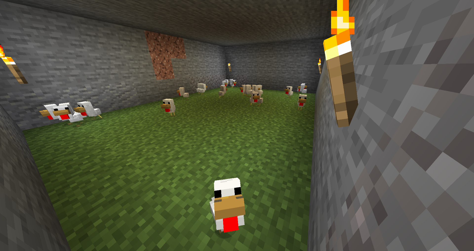 Chickens appear to wander around aimlessly, and usually swim in water. When falling they will flap their wings quickly and fall slowly, making them immune to fall damage. Despite this, they will still avoid falling off high cliffs.