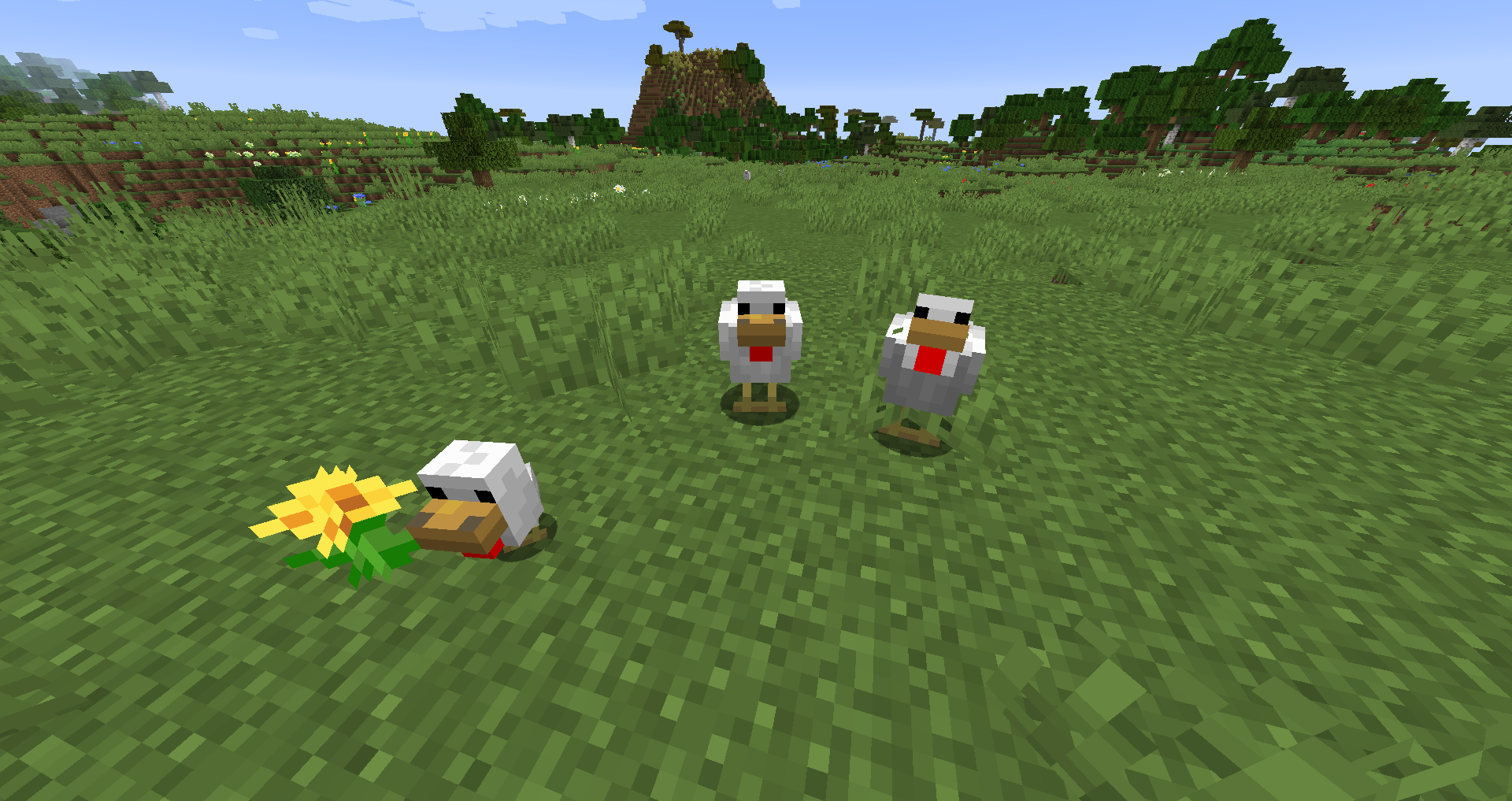 Chickens are passive mobs that first appeared in Alpha mode. The main purpose of chickens is to supply feathers, Raw Chicken and eggs, essential for arrows, food and cakes, respectively. Chickens are 0.875 blocks tall, 0.5 blocks wide and 0.8125 blocks long. They appear very small, with white feathers, and a yellow bill.