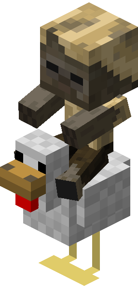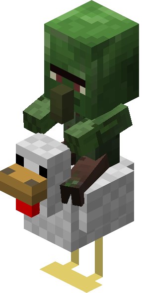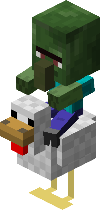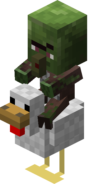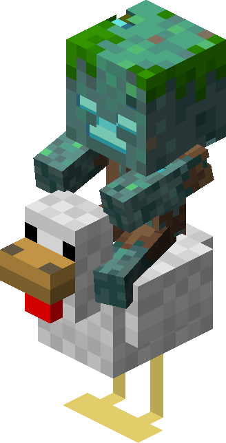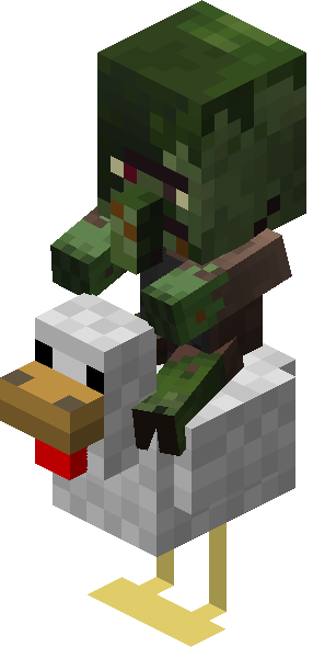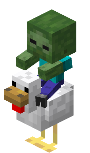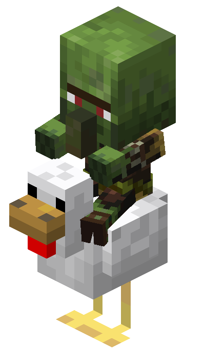 Chicken jockeys[1] are the rare appearance of a baby zombie, baby zombified piglin, baby zombie villager, baby husk, or baby drowned riding a chicken.