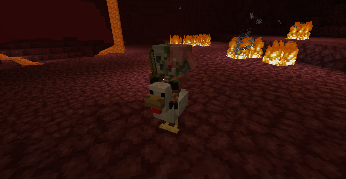 Chicken jockeys may spawn with items equipped. Baby zombified piglin versions of the chicken jockey always have a golden sword equipped, while baby drowned versions may have a trident. Although chickens take damage from magma blocks, baby zombified piglin jockeys still spawn on them, killing the chicken and leaving just the baby zombified piglin. Provoking the zombified piglin chicken jockey causes it to attack, like a normal zombified piglin.