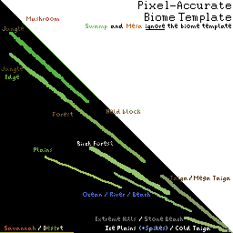 Biome colormaps use a triangular gradient by default. However, only the colors in the lower-left half of the image are used, even though the upper-right side of foliage.png is colored. Furthermore, as shown in the template image to the left, a select few pixels are considered when the colormap is read by the game, and are determined by the code below.