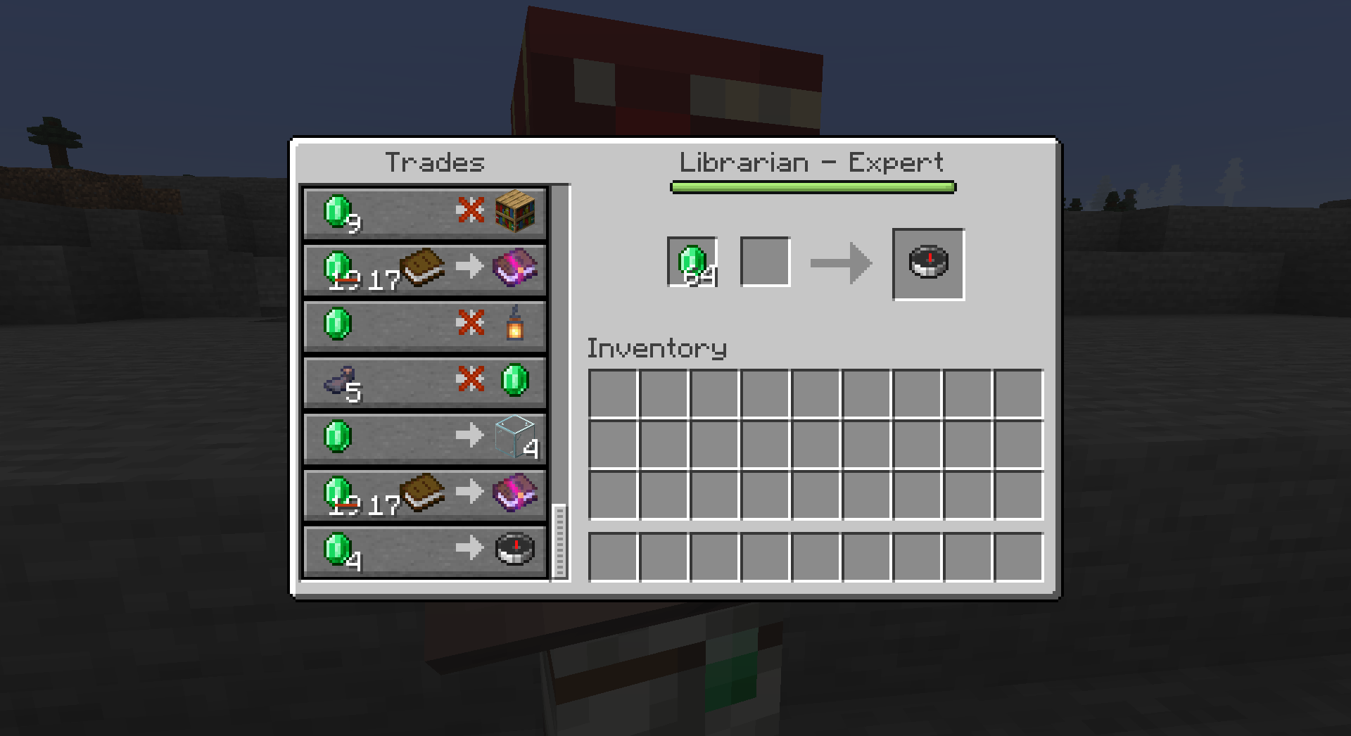 Expert-level librarian villagers have a 50% chance to sell a single compass for 4 emeralds.[Java Edition only]