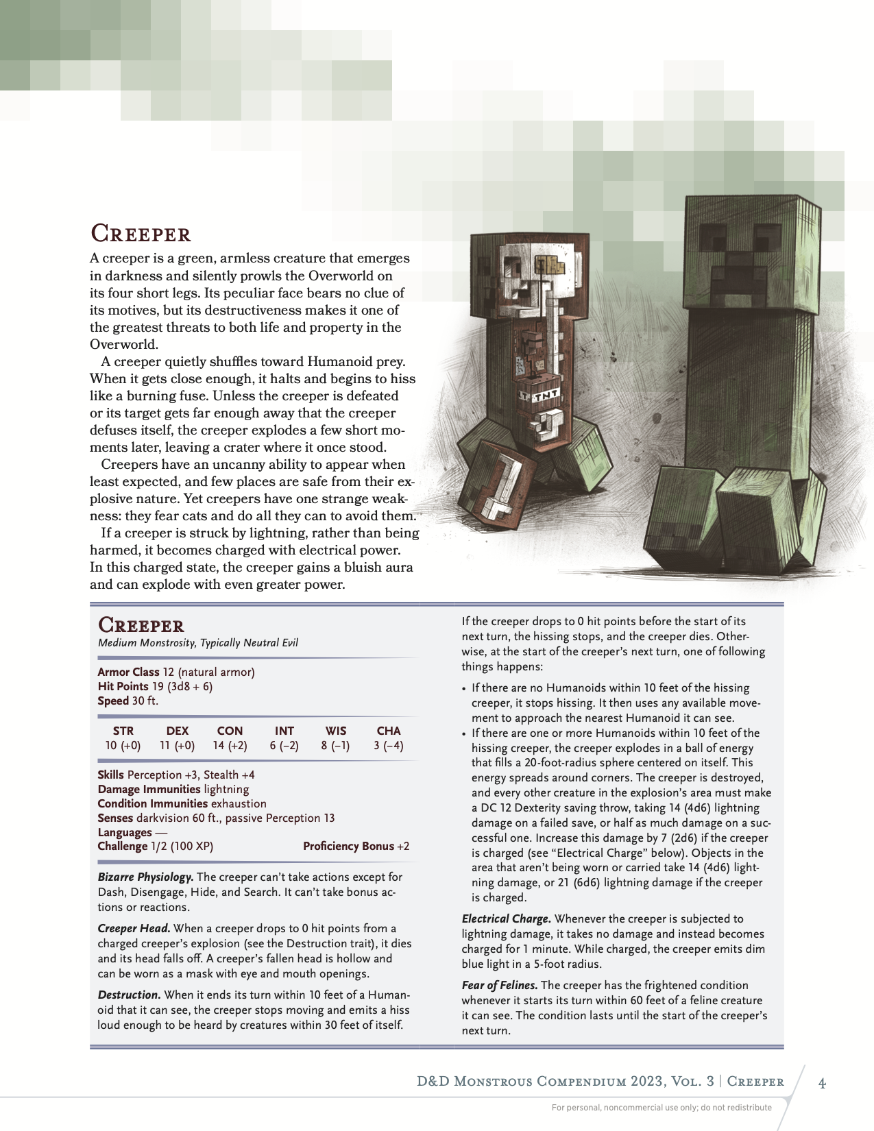- As part of an official collaboration, creepers are included as monsters in a free add-on for the roleplaying game Dungeons & Dragons.[16] In the game, they are "Monstrosities" and have the alignment "Typically Neutral Evil".