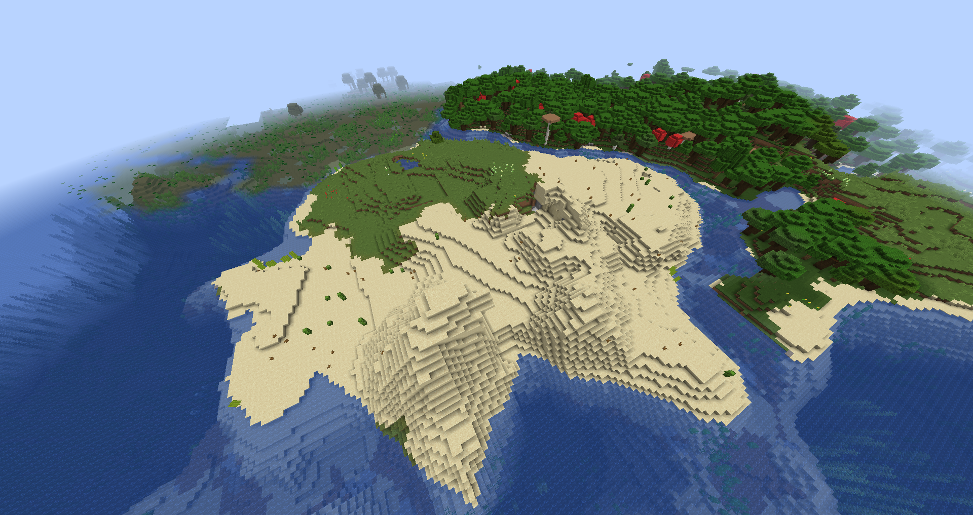 The surface is made entirely of sand, with sandstone generating underneath the sand. Deserts are more likely to generate in areas with high erosion values, which means that the terrain in which they generate is generally flat but with occasional hills, similar to the ones found in windswept hills biomes. Deserts can also generate in lower erosions but usally as a separation between a badlands biome and the oceans. Deserts are often found bordering mangrove swamps or stony shores. Deserts can also generate at any humidity value, and at high humidities, lush caves can sometimes generate underneath deserts.
