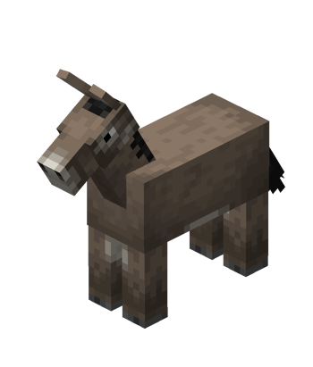 Donkeys are smaller all around than the normal horses and sport long, erect ears. Their manes do not protrude, but rather are drawn directly on the back of their heads and necks. All donkeys have gray-brown coats with darker ankles, ears, manes, and tails. Donkeys cannot be equipped with horse armor, but can be equipped with chests to store up to 15 stacks of items.