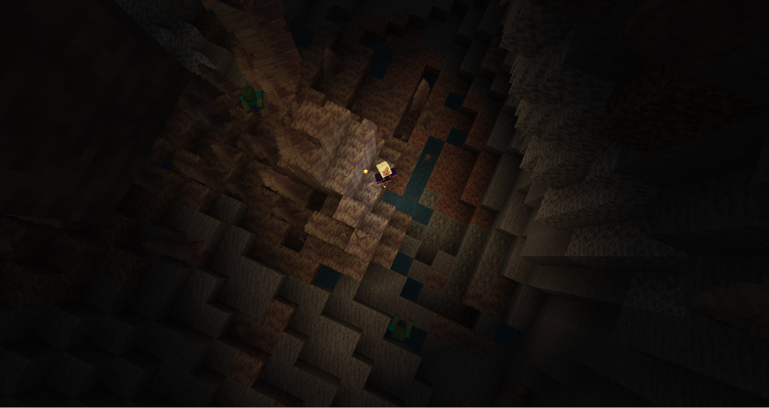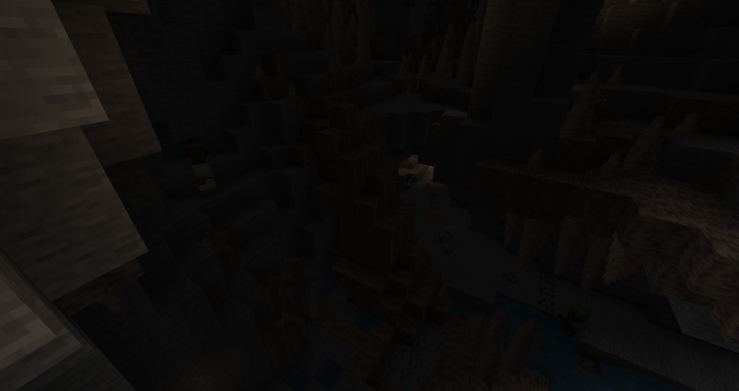 Dripstone blocks and pointed dripstone both hanging as stalactites and growing from the ground as stalagmites, small water wells of 1×1 blocks are generated in the ground. They mostly appear like regular caves, except with patches of dripstone blocks and pointed dripstone. Large dripstone clusters structures generate occasionally inside ravines. This biome also generates larger copper ore blobs compared to other biomes. In Java Edition, drowned are able to spawn in aquifers.