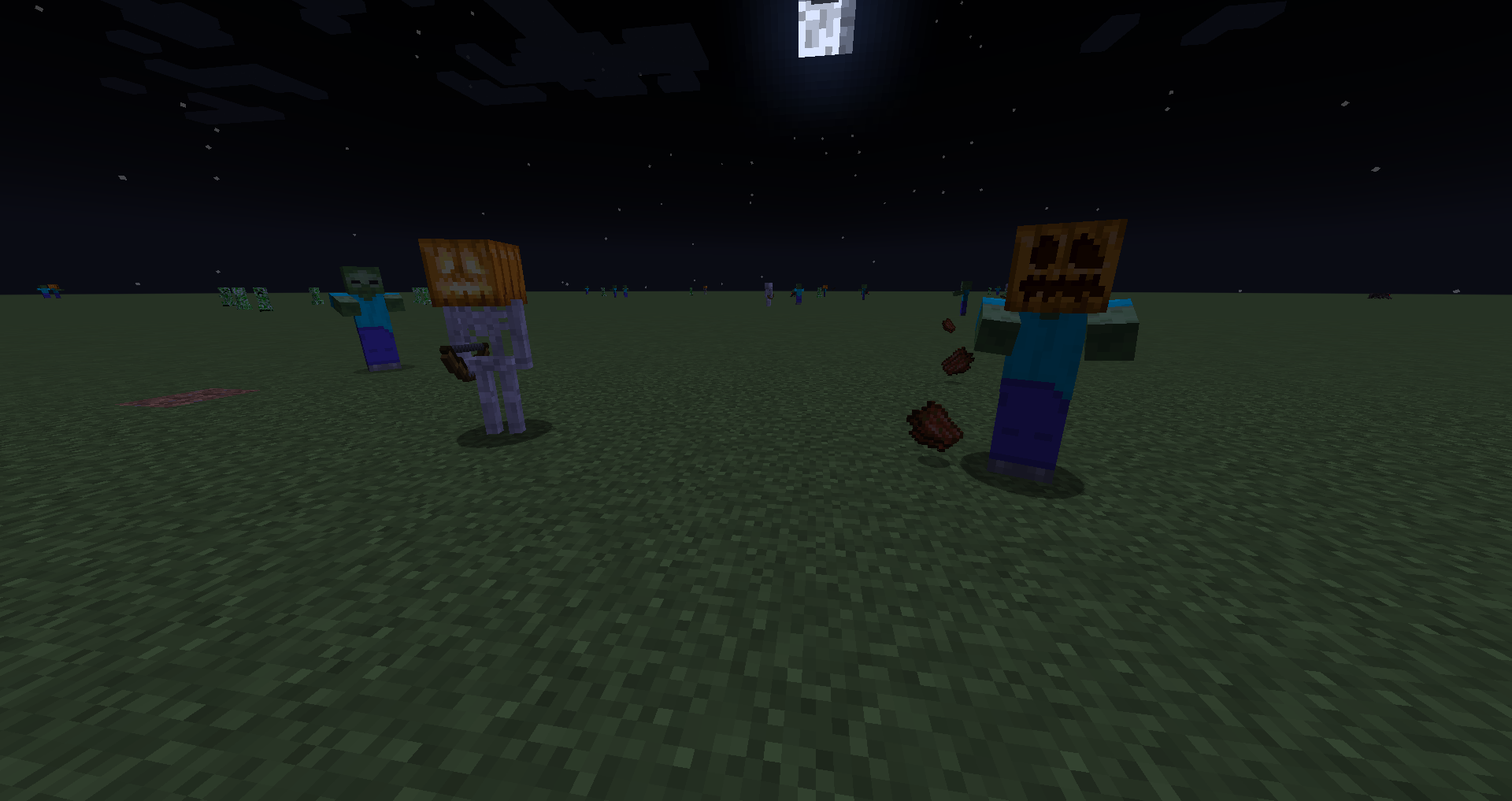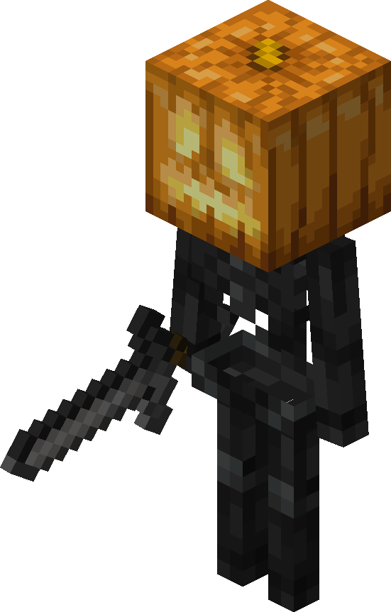 On October 31, zombies, zombie villagers, husks, drowned, skeletons, strays, zombified piglins, and wither skeletons may sometimes wear carved pumpkins or jack o'lanterns on their heads. These mobs would drop these blocks if killed using a tool enchanted with Looting. This feature was added in Java Edition 1.4.2 for Halloween 2012 and every Halloween thereafter.