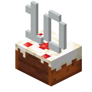 In 1.14.2-pre2 and for the occasion of the 10 years of Minecraft's release on May 17, 2019, the cake had a big "10" placed like candles, and the only splash text that appeared was "Turning 10 years old!"[3] This was reverted to the way they were before on May 20, 2019, and is unable to be seen again in-game even if you go back to 1.14.2-pre2 and change the time of the device to May 17-20 of 2019.