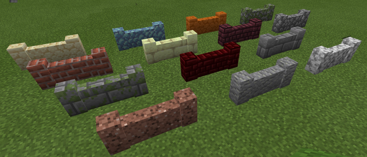 - Added brick, andesite, diorite, granite, prismarine, stone brick, mossy stone brick, sandstone, red sandstone, nether brick, red nether brick, and end stone brick walls.