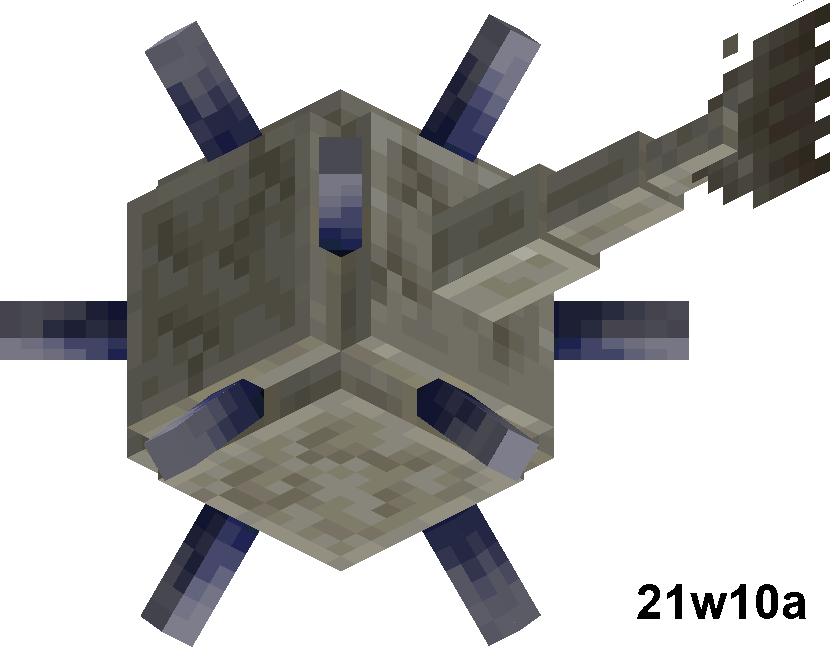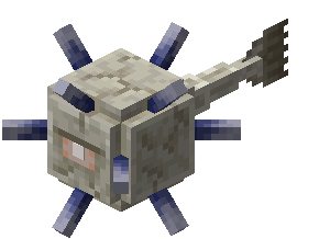 The elder guardian ghost has the same model and texture as the elder guardian, but uses the player hurt sound, has less health, and is missing the back tail model. When spawned outside of water, it floats upward until it despawns, similar to a mob tied to a balloon, or under a high level of levitation effect, but it passes through blocks.