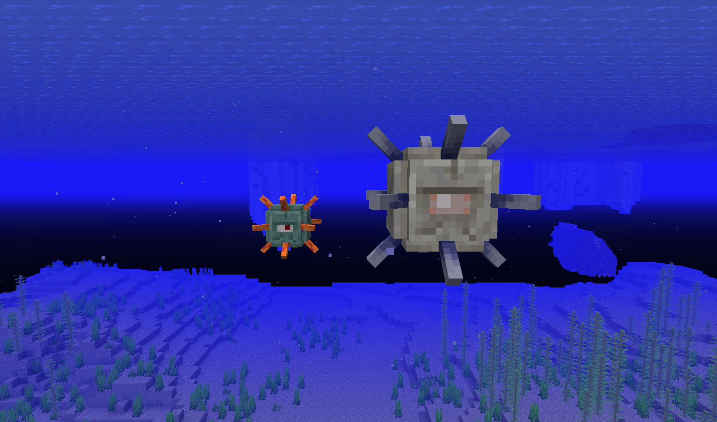 An elder guardian is a stronger and larger variant of the guardian, and the largest aquatic mob. It attacks the same way as a normal guardian, but also applies Mining Fatigue to players in a large radius around itself. They are only found in ocean monuments; three of them generate in each one.