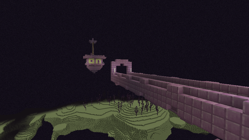 When generated, the stern of the ship always faces toward the city and the bow always faces away. It generates in front of a bridge with a gated arch at the end, from which one can throw an ender pearl to reach the ship, or build a bridge.