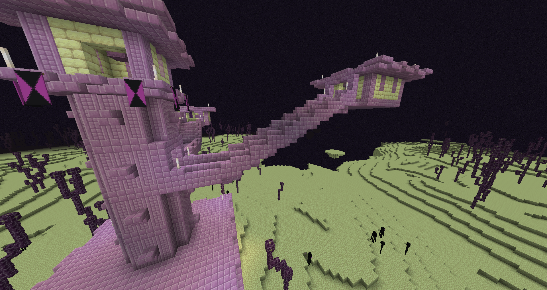 End cities consist of tall skyscraper-like towers constructed out of end stone bricks and purpur blocks. An End city may generate as a single tower by itself, or as a sprawling complex of inter-connected towers and pathways branching from a main tower. End rods and ender chests are the only source of light. Many shulkers spawn around the city, and guard its various treasures. Decorative banners hang at the tops of some towers.
