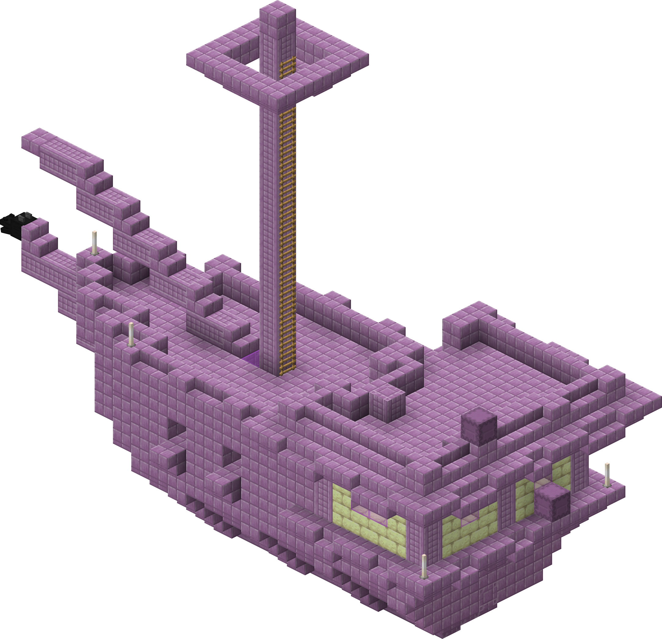 The end ship is made of end stone bricks and purpur blocks, just like the city's main towers. It is built similarly to classical pirate ships or Dutch colonial ships. Three shulkers spawn on the ship; one on the main deck, one behind the stern of the ship, and one in the treasure room.