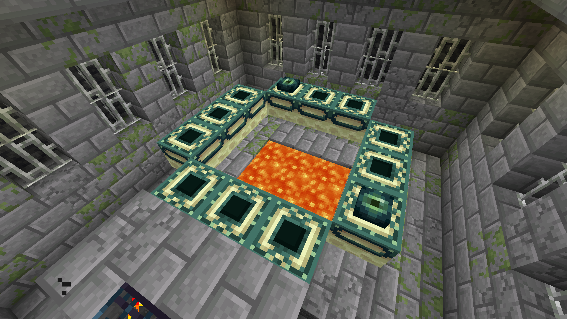 End portals are found within the portal room of a stronghold, hanging horizontally over a pool of lava, with a staircase leading up to the portal. A silverfish spawner sits in the staircase. Each individual end portal frame block has a 10% chance of containing an eye of ender, as determined by the world seed. This means there is a one in 1 trillion chance for all 12 end portal frames to contain an eye of ender, activating the portal upon initial generation. The frame has the highest probability of generating with only one eye of ender (37.7%), with probabilities dropping to 28.2% for zero, 23.0% for two, 8.52% for three, 2.13% for four, and a total of 0.433% for five or more. Because of the massive amount of possible seeds, over 8 million seeds in Java Edition that generate portals with 12 eyes of ender are known.[2]