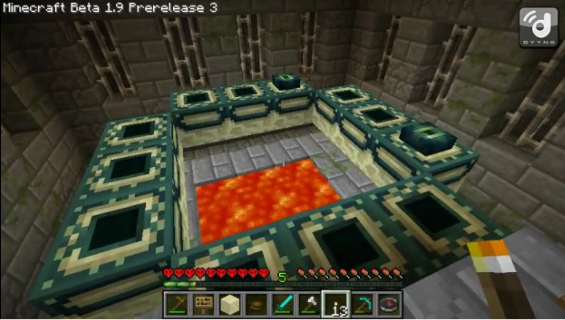 A Beta 1.9 pre4-style portal as seen in Jeb's live stream. It appears to have slots for eyes of ender.[3]