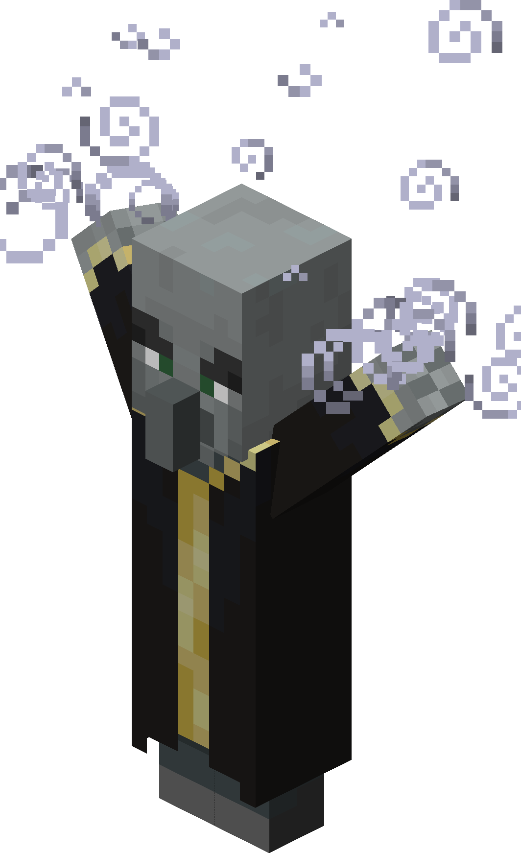 An evoker is a spell-casting illager found in woodland mansions and raids, and the only source of the totem of undying. It uses two spells to attack; one that summons armor-piercing fangs and one that summons vexes.