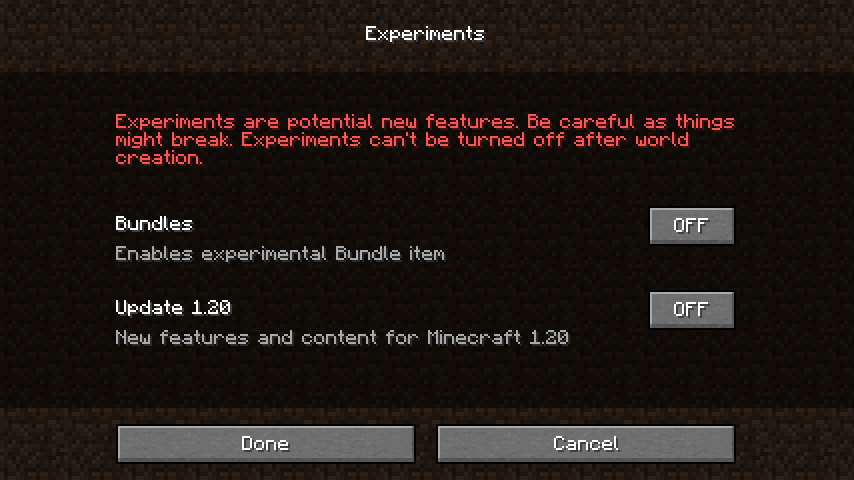 Experimental Gameplay (also known in-game as Experiments) is a game option exclusive to Bedrock Edition. In Java Edition, experimental features are available behind separate data packs. When enabled, it allows players to test some unfinished or work-in-progress features that will eventually be released in future updates.
