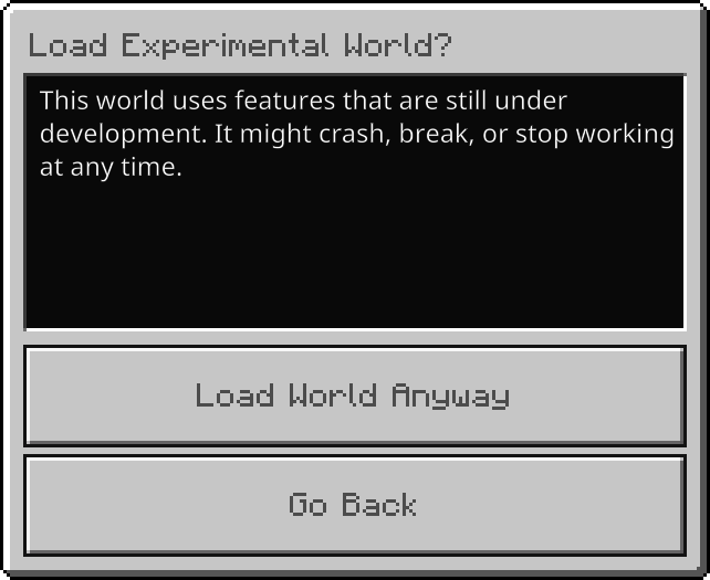 The warning message when attempting to play on an experimental world.