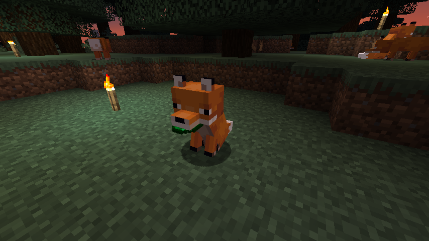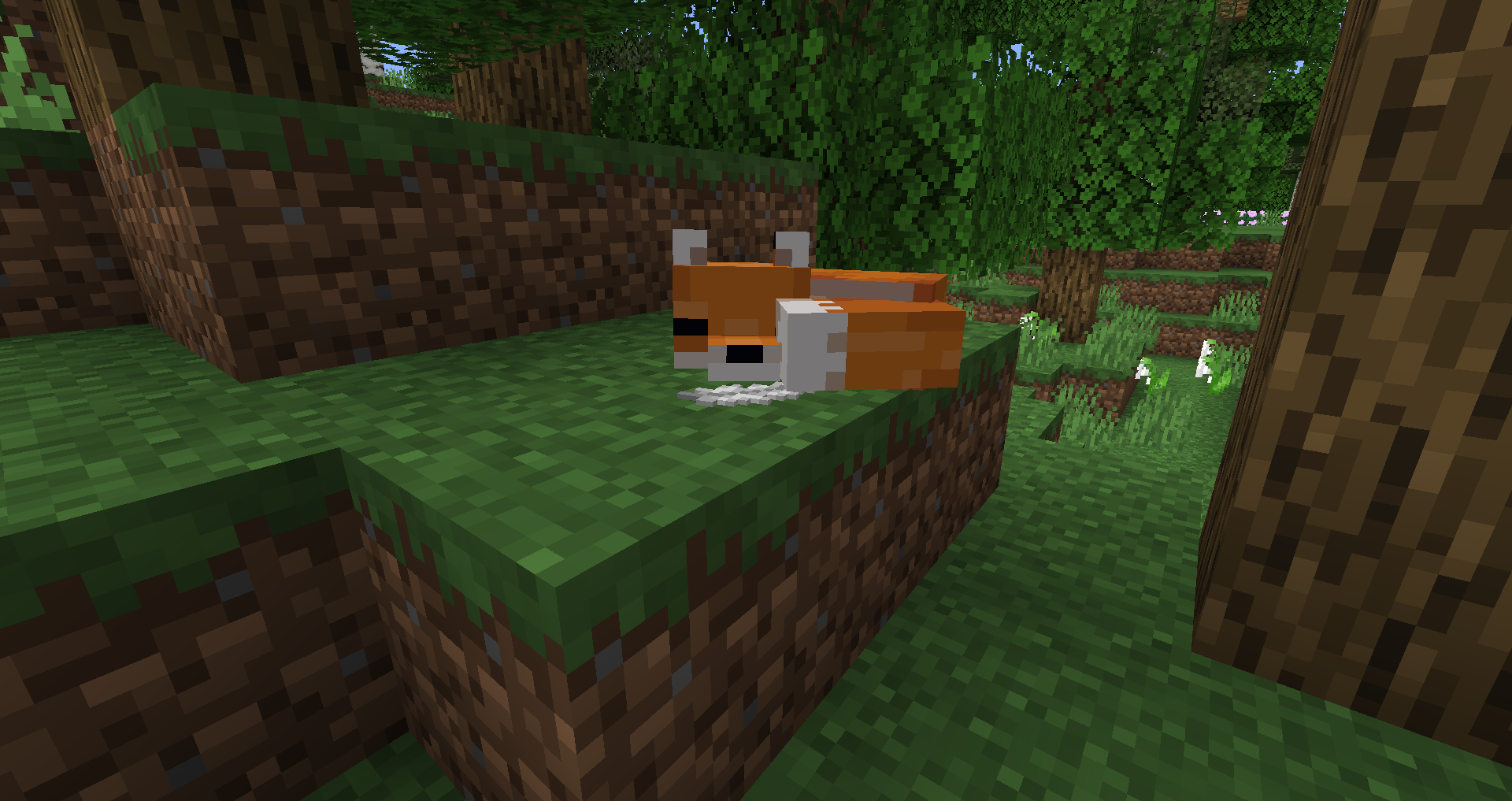Foxes move quickly like ocelots and flee from nearby players and wolves. However, they do not flee if the player approaches them while sneaking. They are unaffected by sweet berry bushes, taking no damage or speed reduction while moving in them. Breeding 2 adults with sweet berries produces a kit that trusts the player but follows nearby adult foxes. Naturally spawned kits do not trust players.