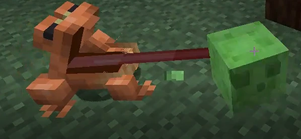 Frogs also attack small magma cubes, leaving a froglight block. When the magma cube gets targeted, the frog will walk towards it at a faster pace before attacking. The color of froglight that drops depends on the type of frog that attacks the magma cube: