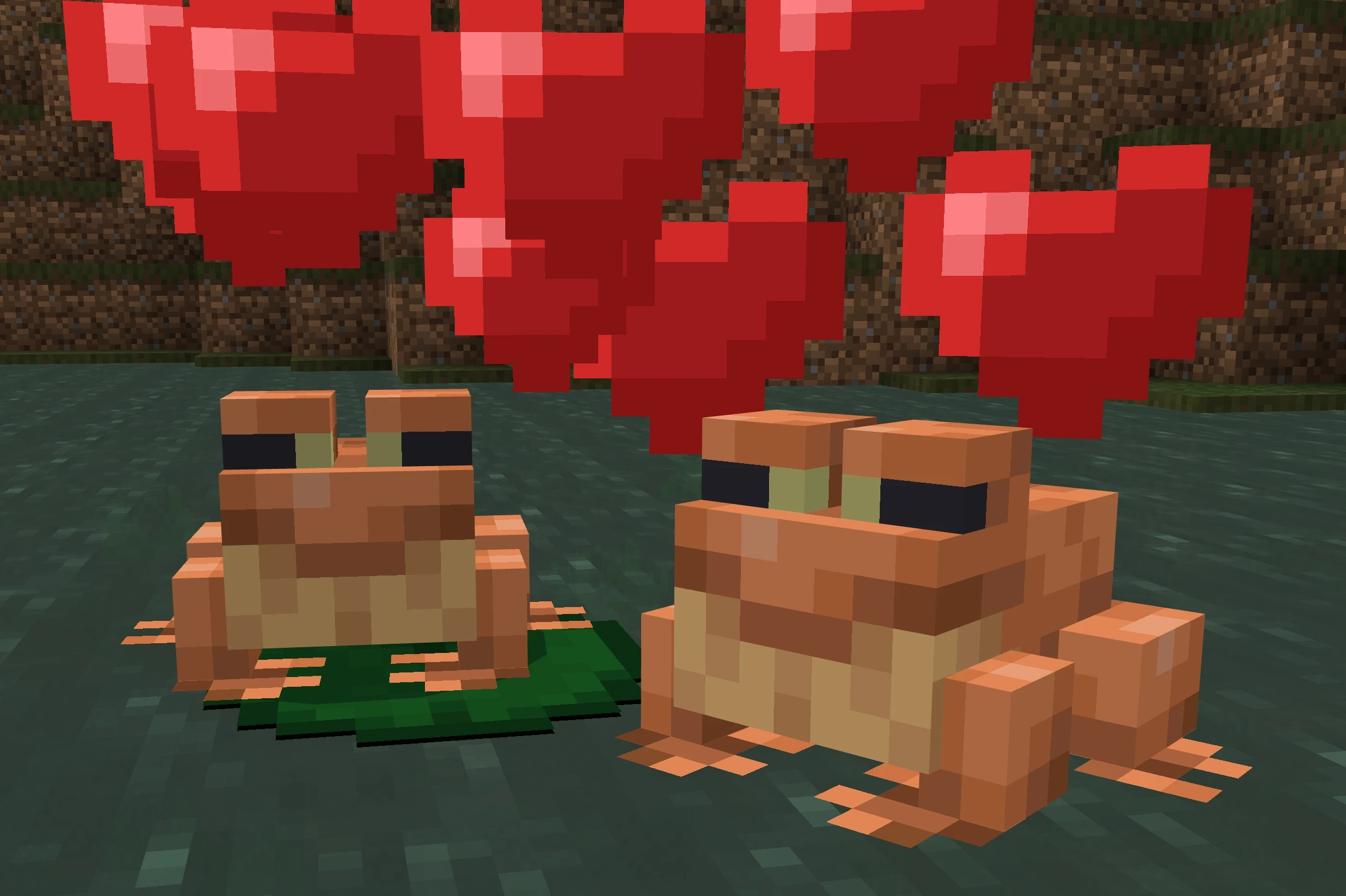 Feeding two frogs a slimeball causes them to enter love mode, causing one of the frogs to become pregnant, similar to turtles. The pregnant frog then searches for a water block with at least one adjacent water block (flowing or source) with air above to lay frogspawn. This spawn later hatches into tadpoles, which subsequently grow into frogs.