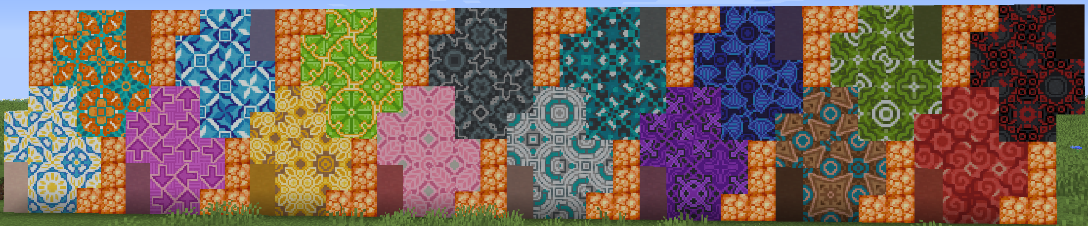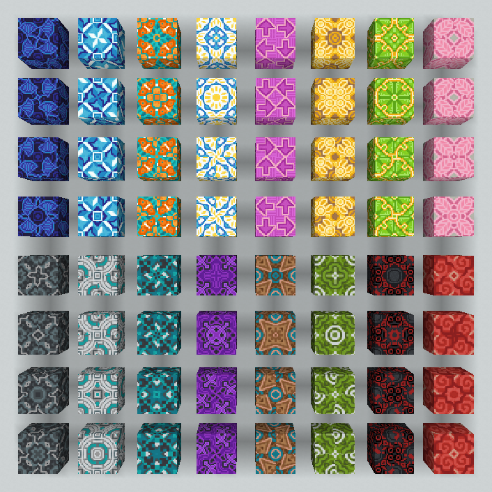 Glazed Terracotta blocks are designed to form a larger, cohesive pattern when placed in the correct 2×2 configuration. Most textures have reflection symmetry along a diagonal line that goes from corner to corner, though the colors of individual pixels can differ slightly.