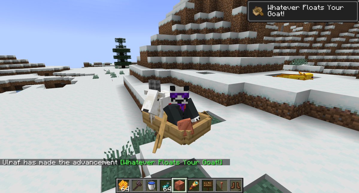 | Whatever Floats Your Goat | Get in a boat and float with a goat | Use a boat and put a goat inside that boat, then ride it | 20G | Bronze | ||