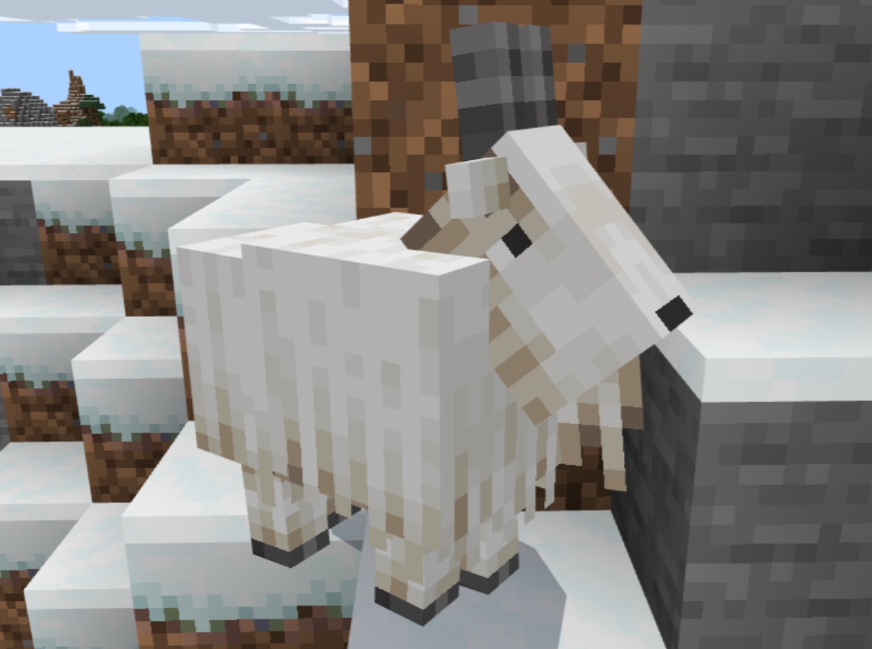 A goat is a neutral mob found in certain mountainous biomes. Goats can jump especially high and ram mobs. They are a source of goat horns and milk.