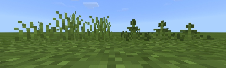 - Grass is slightly offset from the block it is sitting on (as seen in the second screenshot). This causes fields of grass to appear more contiguous.