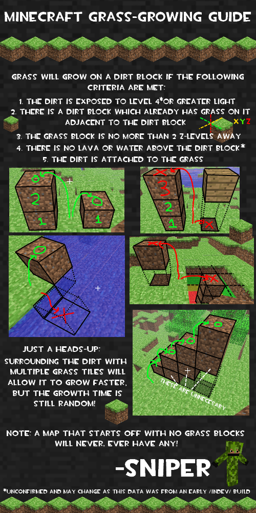 In Alpha Survival Mode, dynamic lighting allowed Grass to live and spread in partial darkness. Grass takes a short amount of time to mine by hand, but a Shovel will quicken the process if a large amount of Grass needs to be dug out. When mined, Grass drops a Dirt block. Tilling Grass with a Hoe will occasionally drop Seeds, unlike Dirt . Using the new "/give" command in Survival Multiplayer, Grass tiles can safely be directly placed. The block features the side face on all sides of the block before being placed; most likely due to the way blocks are handled as resources.