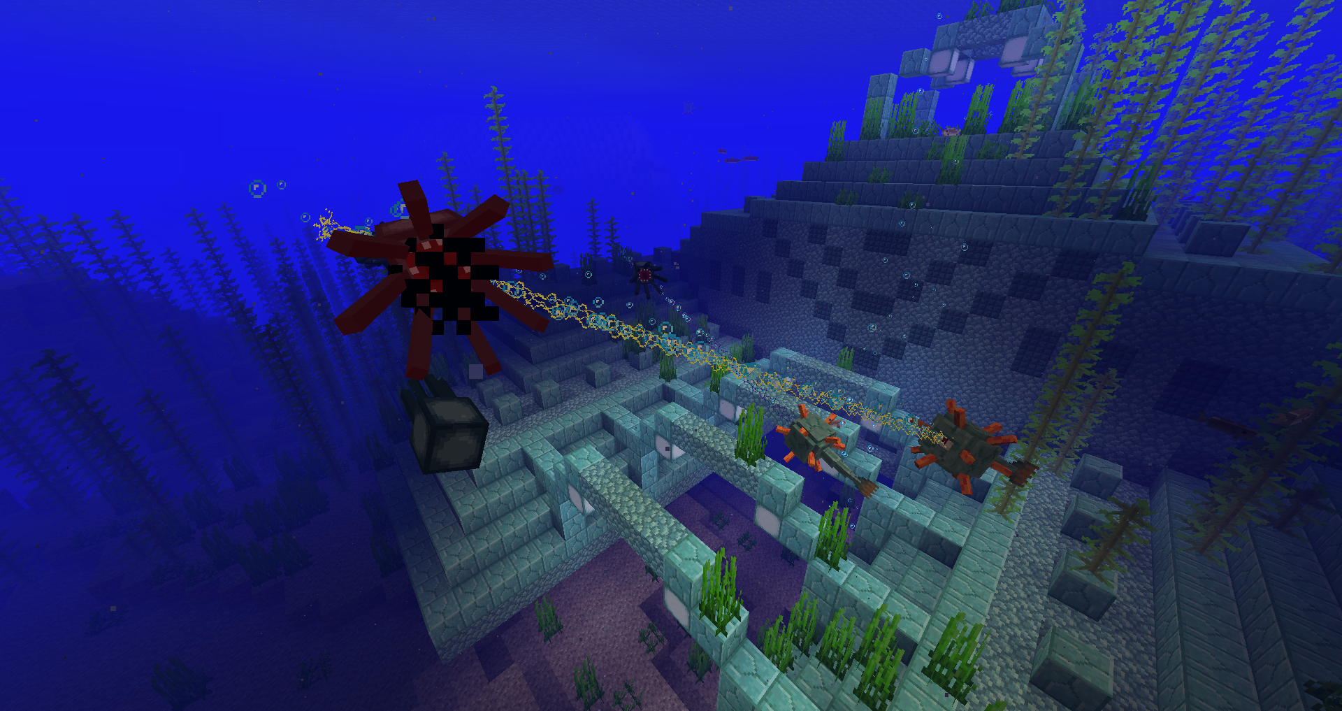Guardians are pufferfish-like hostile mobs that spawn in and around ocean monuments. They attack with a slow-charging laser beam, and inflict retaliatory damage when damaged by a melee attack.
