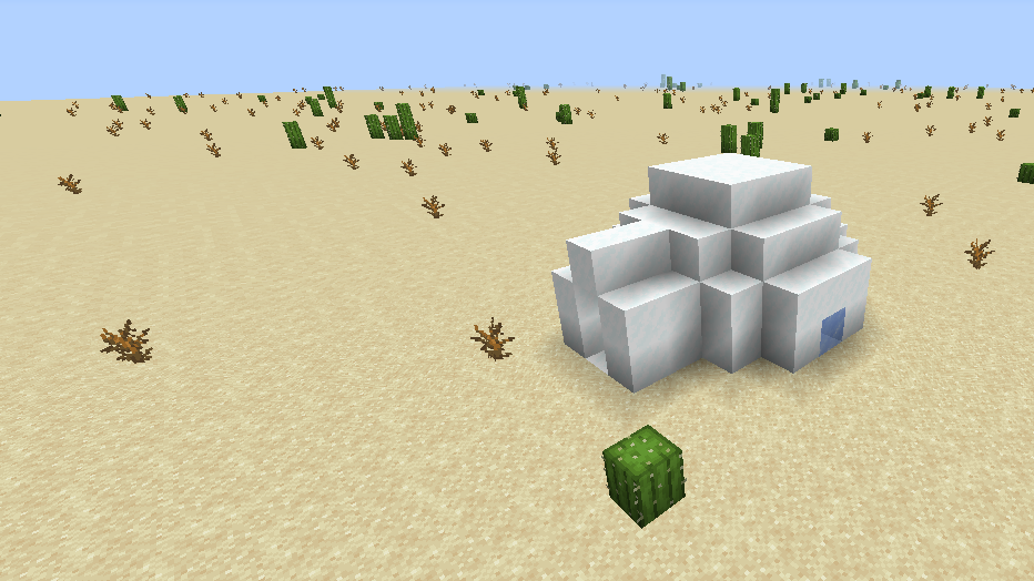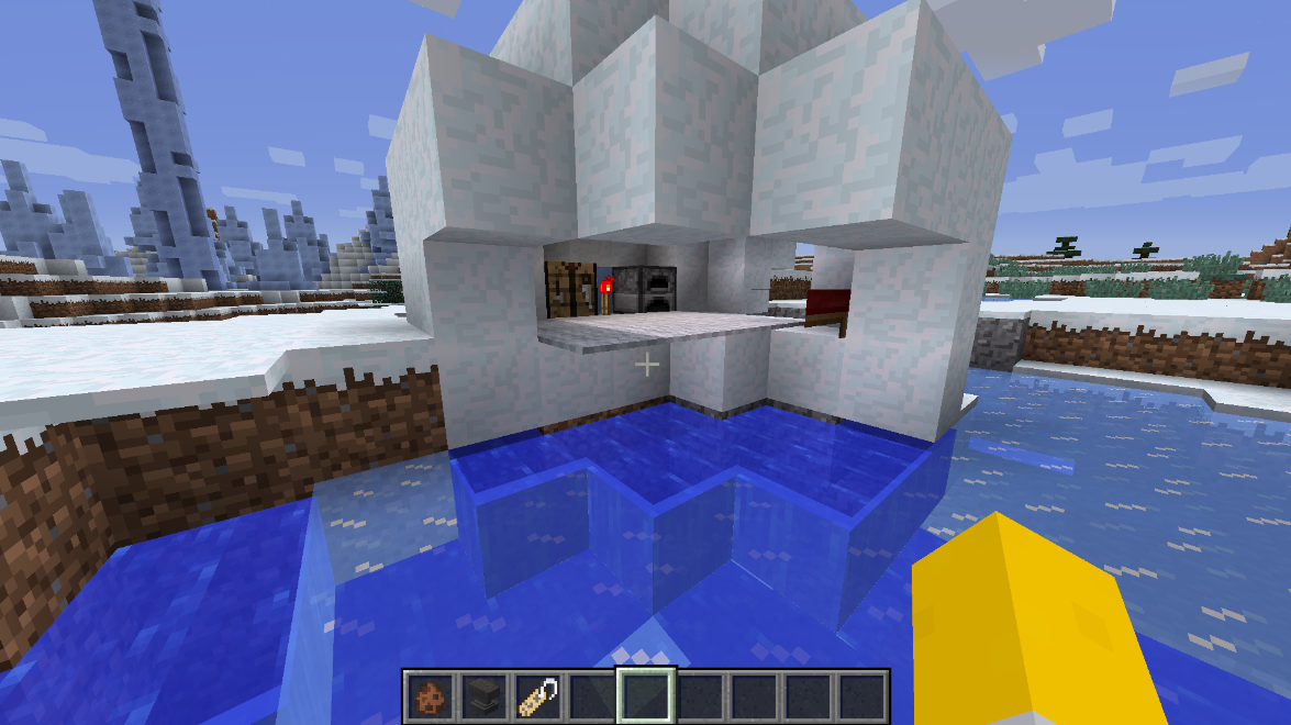 Igloos may serve as a small house and are composed primarily of snow blocks, sheltering a carpeted interior containing a bed, furnace and crafting table.