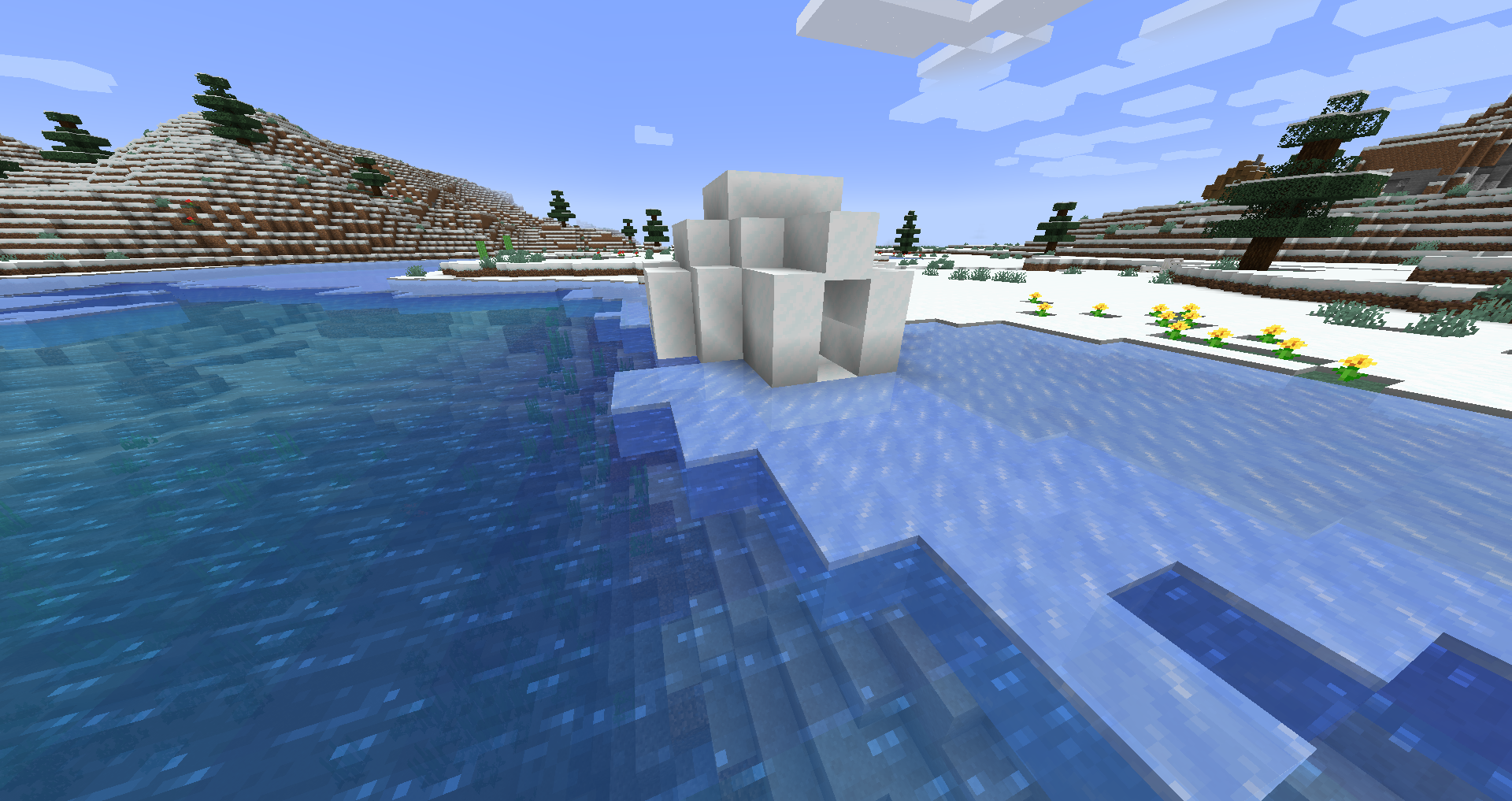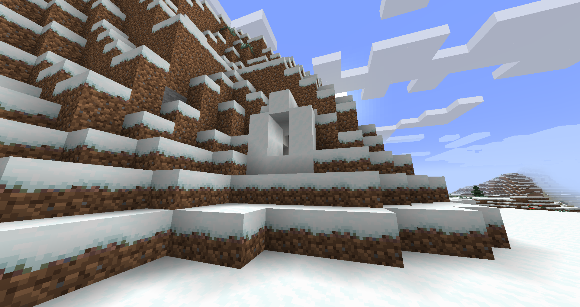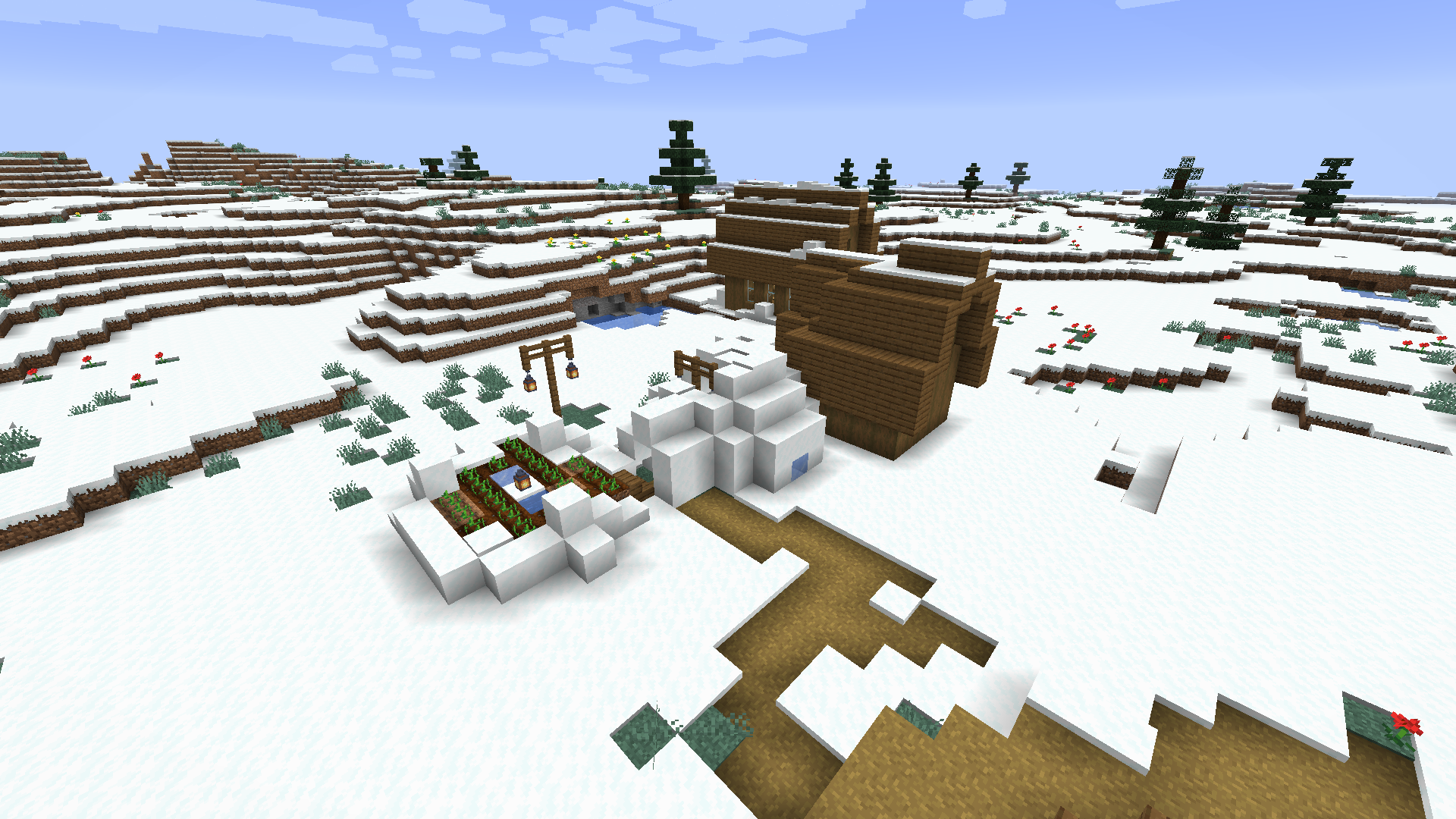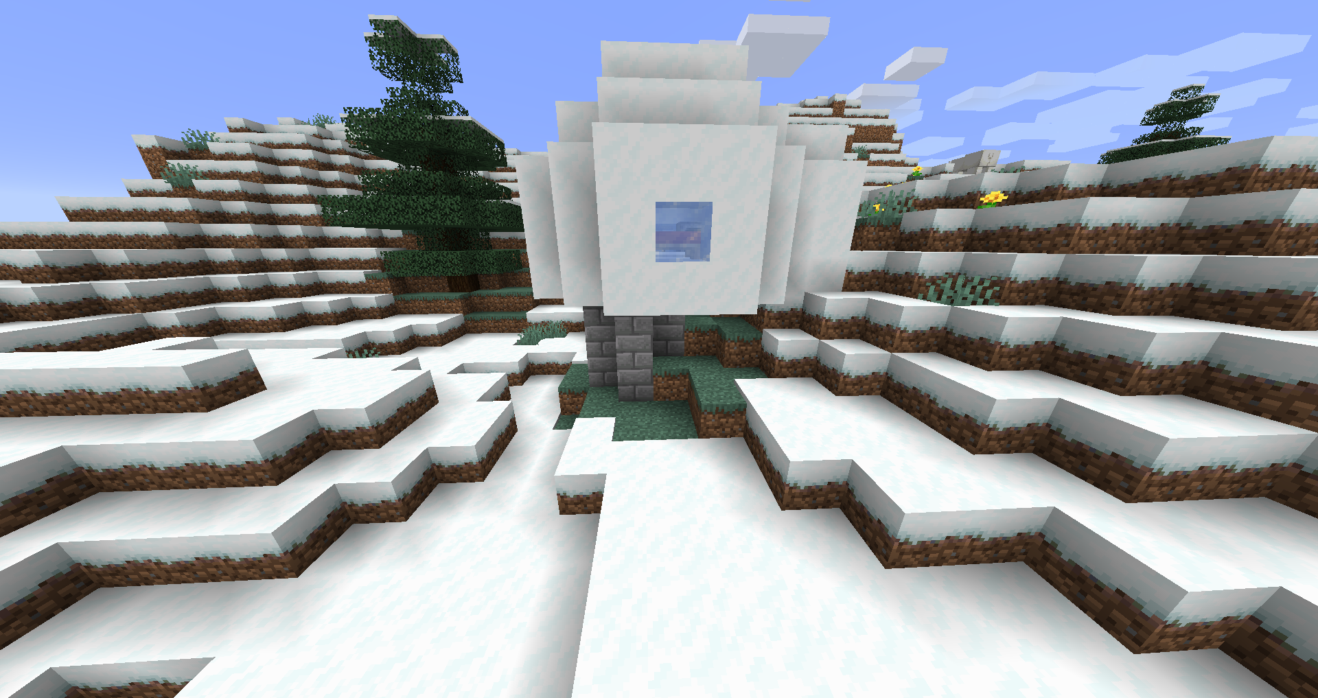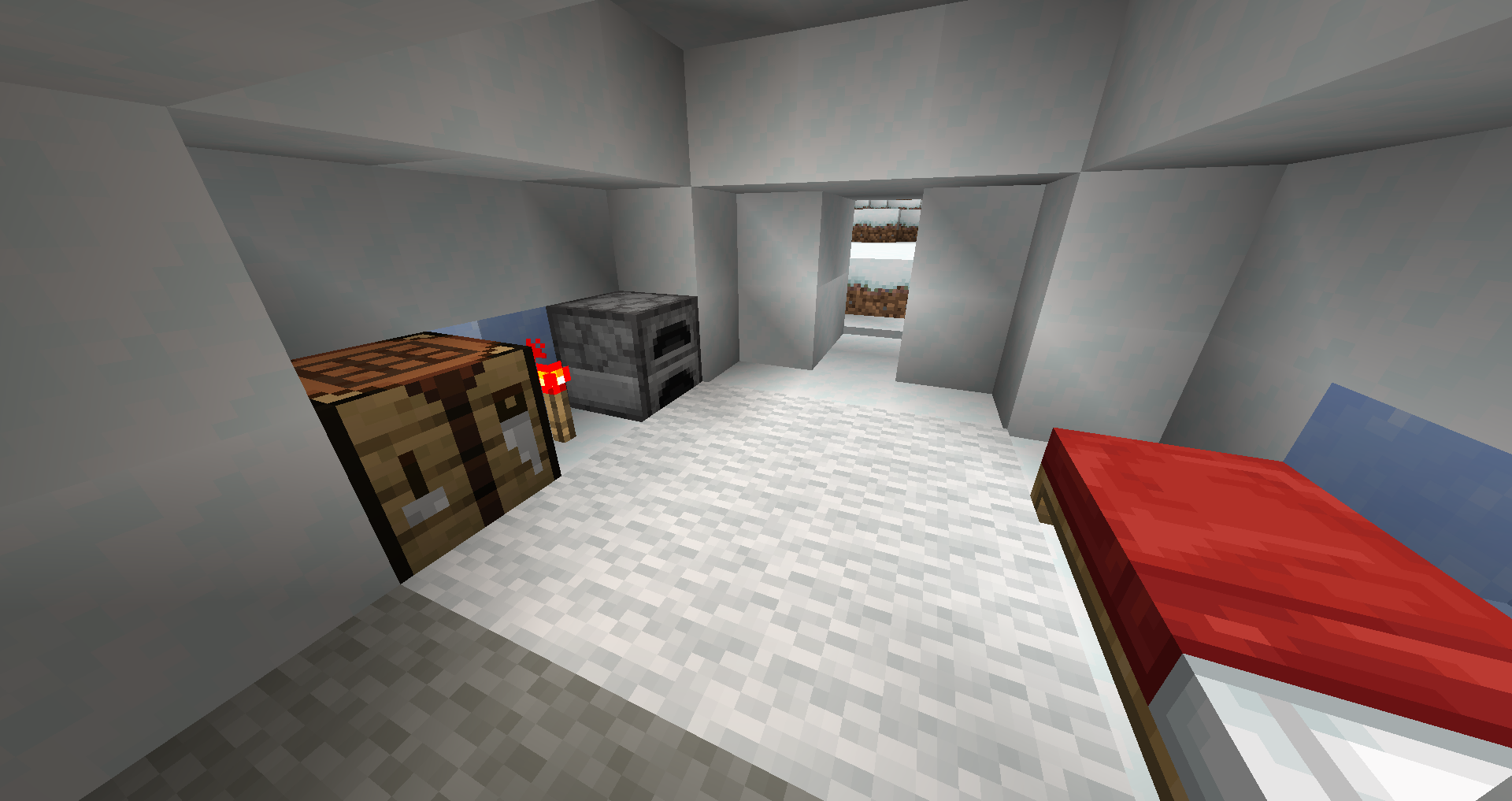Igloos may serve as a small house and are composed primarily of snow blocks, sheltering a carpeted interior containing a bed, furnace and crafting table.