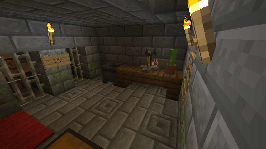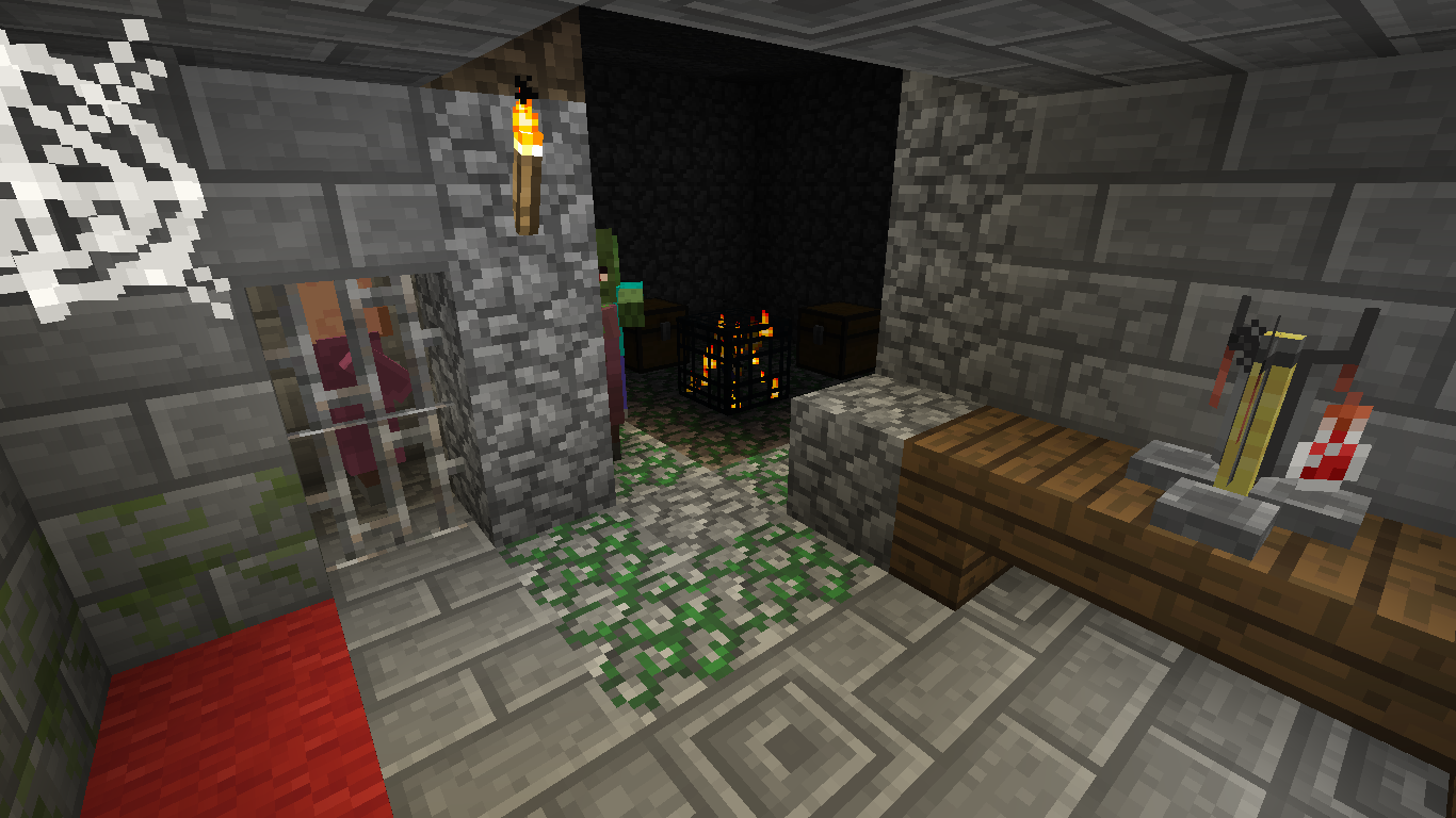 The basement, made of various stone blocks and infested stone blocks, containing a villager and a zombie villager. |