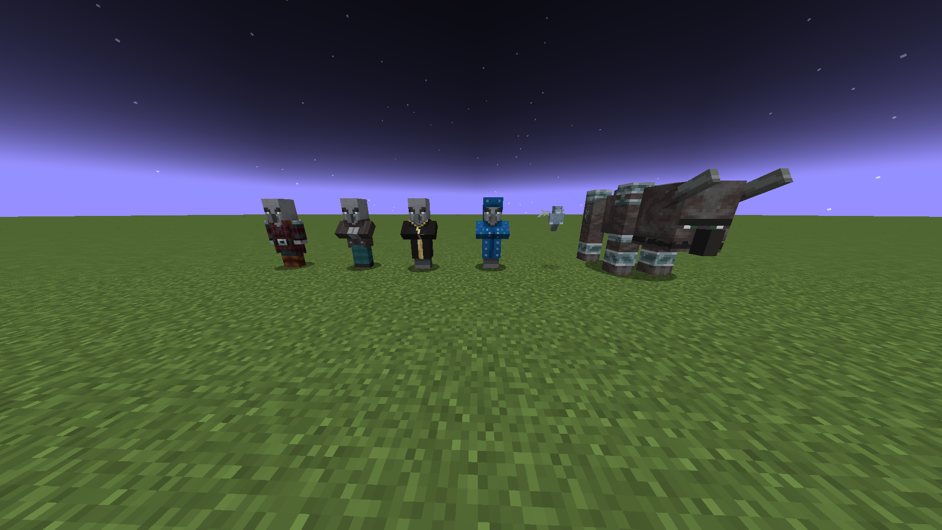 - Patrol — a naturally spawned group of five pillagers roaming the landscape and monitoring the villages.