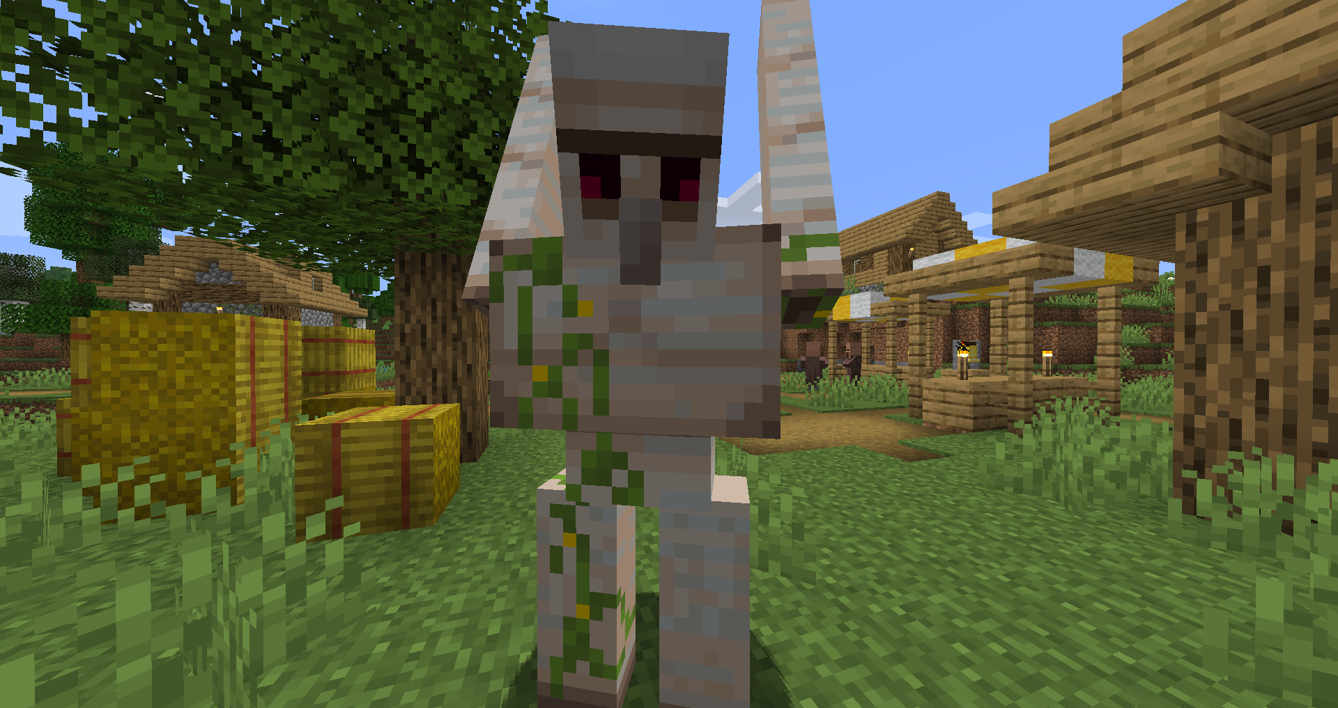 Iron golems can also be found surrounding pillager outposts, confined inside dark oak cages. When freed, they can help the player by attacking any nearby pillagers. Pillagers do not attack iron golems in cages, although the iron golem can attack any pillagers that are one block near the cage, because iron golems can attack through a one-block wall.