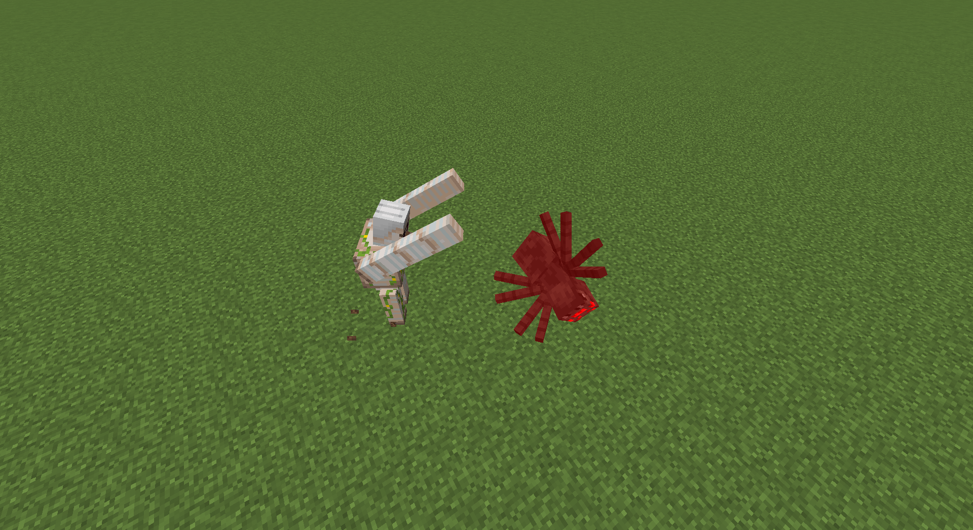 An iron golem attacking a spider by throwing it into the air.