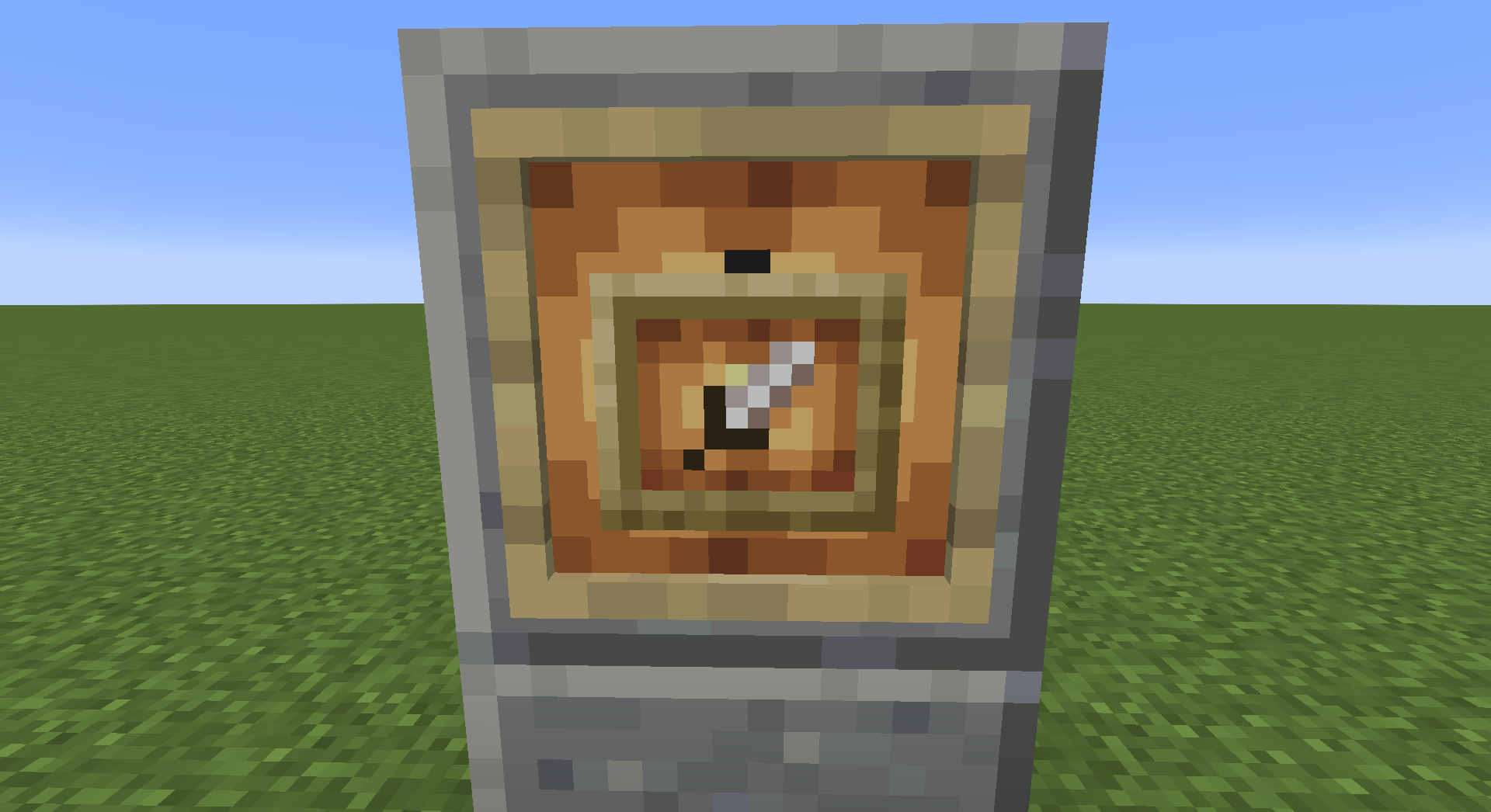 The displayed item can then be rotated by right-clicking the frame. Items displayed in the item frame can turn 45° diagonally, with a total of 8 possibilities (90° and 4 possibilities if it is a map), and the frame outputs a redstone signal depending on the rotation phase that can be interpreted by a redstone comparator (note that this rotation value is separate from the clock or compass rotation). As long as the frame remains placed, it remembers the orientation of the last item it held, and uses it for the next item it holds.[Java Edition only]