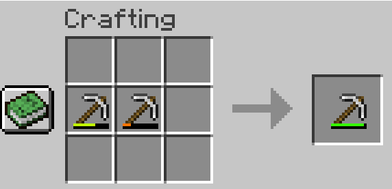 Two items of the same type and material can be placed anywhere on the crafting grid or grindstone, which results in a single repaired item. The durability of the repaired item equals the sum of the old items' durability plus a 'repair bonus' of 5% of the item's maximum uses, up to a limit of the maximum durability for that item. Repairing gives a slight benefit in conserving inventory space, as it combines two non-stackable objects into one.[1]