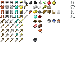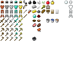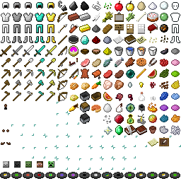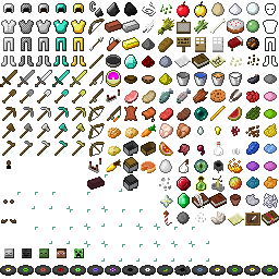items.png is a fixed-width 256×256-pixel file that is split into different 16×16 squares which correspond to the texture of each item found in-game. Like with particles.png, unused sections of the texture are completely transparent, unlike with terrain.png and the paintings sheet where such regions are colored magenta.