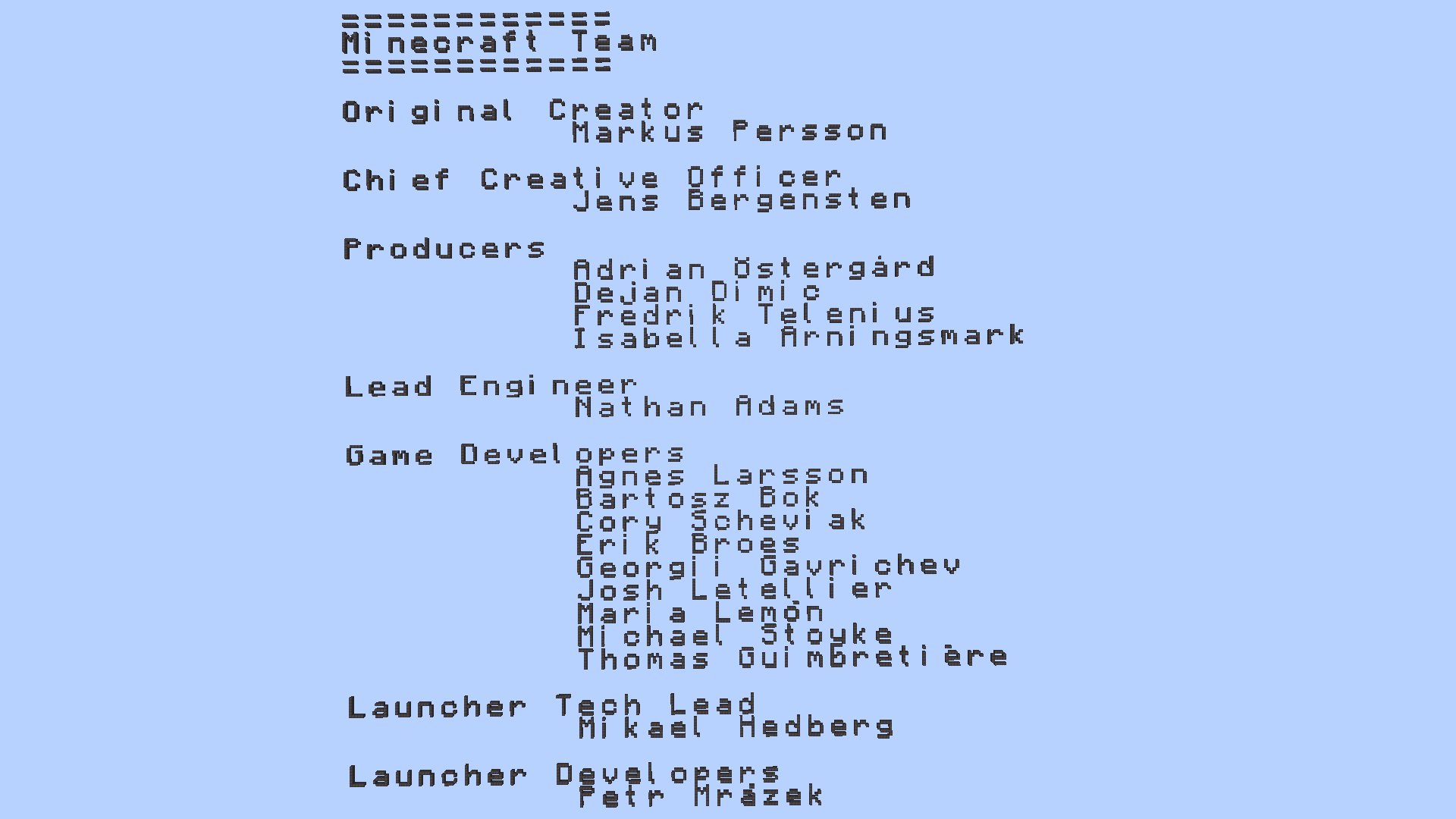 - When the game is loaded it displays the company name MOJANG underneath it with a person singing "Mojang!" similar to how "Sega!" would be sung on a Sega startup screen. The same sound was also used in 3D Shareware v1.34. Occasionally, it will be higher-pitched.