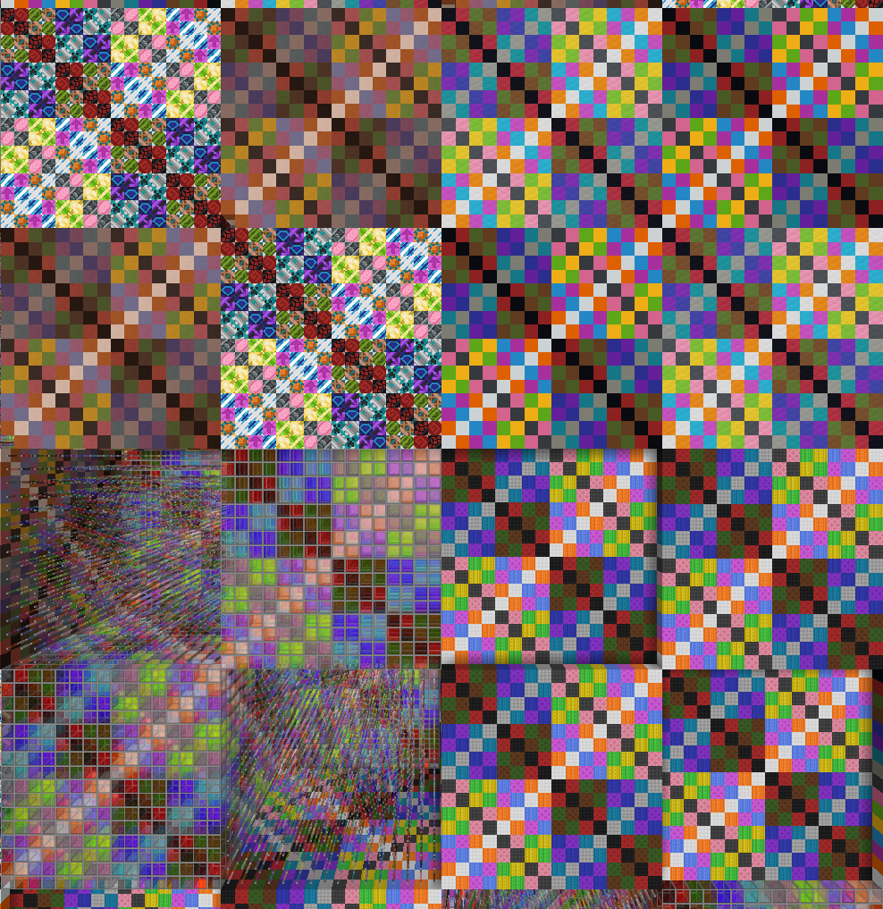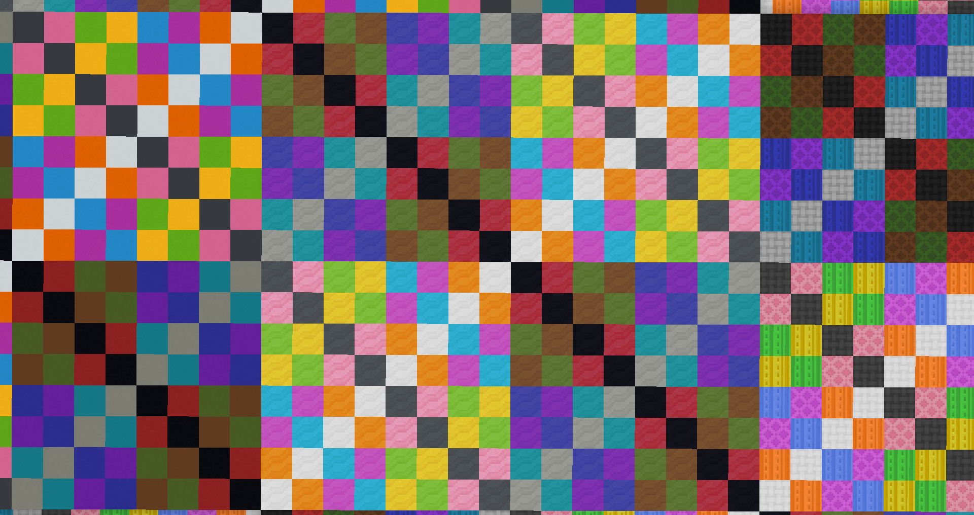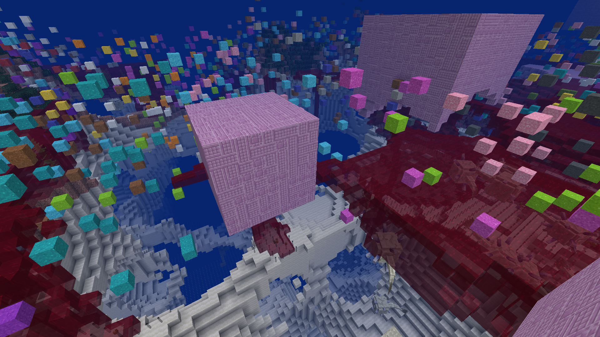 _generated:3) resembling the nether-like dimension with floating mineshafts and magenta glazed terracotta, along with the water surface up to Y-level 31, bedrock on top like in the nether, and with bluish-green lighting in the dark, then dark blue, then dark purple, then grayish-red, then orange, then light green, then turns into magenta again (in fact in block light from level 0 through 15 and no sky light from top). Also, the menus in_generated:3are reddish tinted. - The uniquely generated dimension ID 2147483647 (
