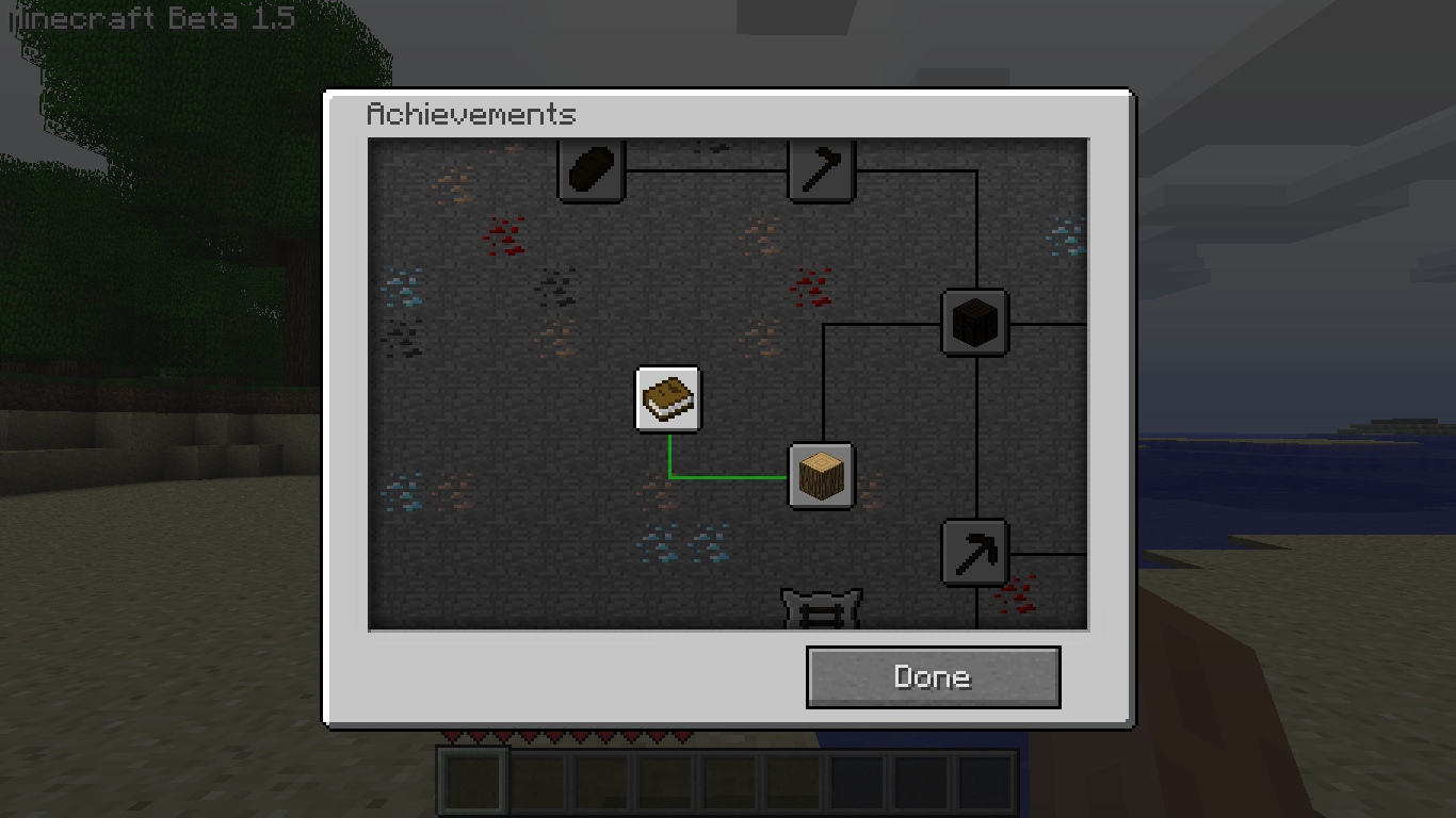 Beta 1.5 added statistics and achievements, new types of rails and saplings, cobwebs and other changes and fixes.