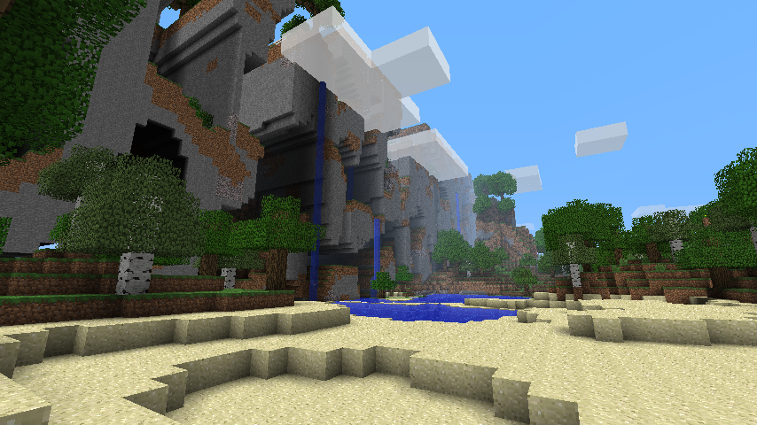In both zones, any area beneath sea level, excluding regular caves, are flooded with water. The Far Lands generate biomes, but most biomes are indistinguishable except by the color of grass. Desert biomes are covered in sand and snow-covered biomes are covered with snow, excluding the very top of the map due to the height build limit. Trees generate somewhat normally, but can be found only in the upper areas of the map due to the need for grass.